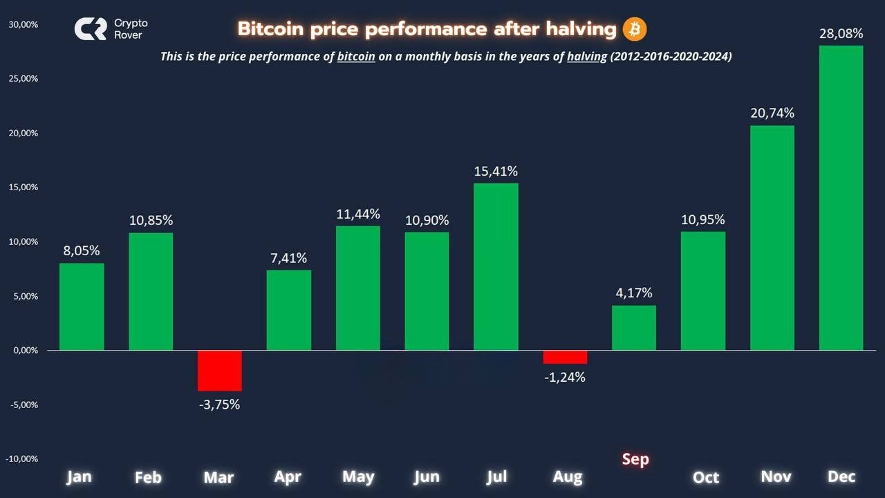 Evenzo verwacht analist Crypto Rover dat de beste koersprestatie van Bitcoin in Q4 zal plaatsvinden, verwijzend naar historische patronen na halving-evenementen.