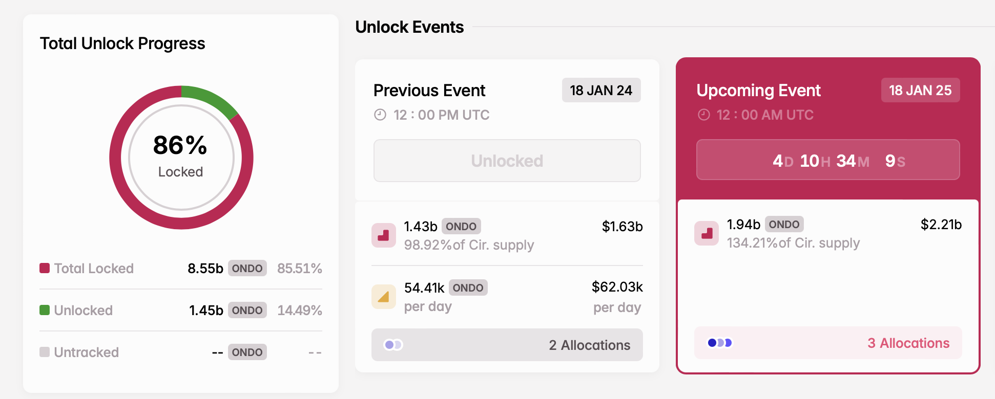 De ONDO token unlock op 18 januari is een van de belangrijkste crypto-evenementen deze week. Zoals BeInCrypto meldde, zal Ondo Finance 1,94 miljard ONDO tokens vrijgeven, momenteel gewaardeerd op $2,15 miljard. Deze unlock vertegenwoordigt 134,21% van de huidige circulerende voorraad. De tokens worden toegewezen aan deelnemers aan de private sale, ecosysteemgroei en protocolontwikkeling.