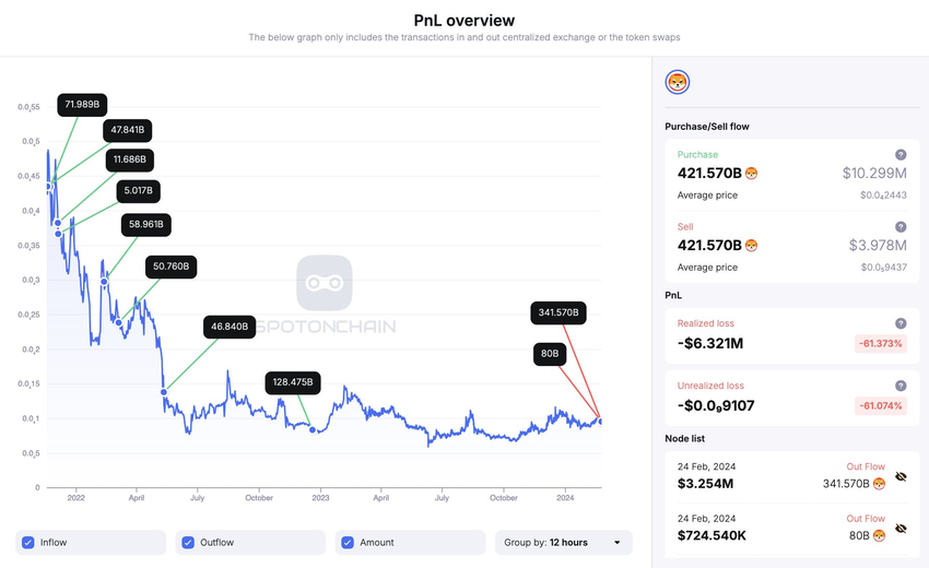 De whale verkocht naar verluidt 421,6 miljard SHIB-tokens tegen $ 0,000009437 per stuk, in totaal $ 3,98 miljoen. De transactie, uitgevoerd op 24 februari, werd geïnitieerd op Binance, de grootste cryptobeurs qua handelsvolume, en een niet nader genoemde Decentralized Exchange (DEX).
