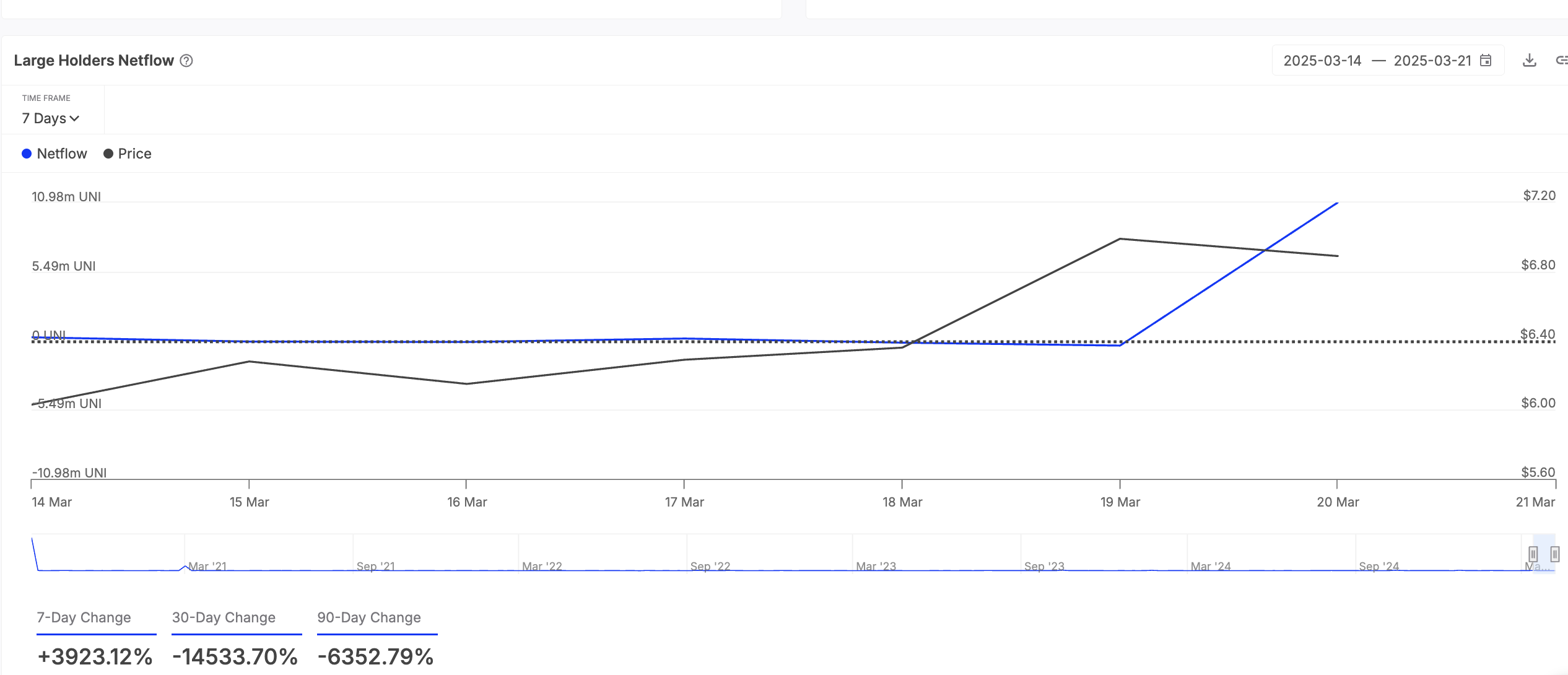 De decentralized finance (DeFi) token UNI heeft deze week veel aandacht gekregen van whales. Dit wordt benadrukt door de aanzienlijke stijging in de netflow van grote houders tijdens de beoordelingsperiode. Volgens gegevens van IntoTheBlock is dit in de afgelopen zeven dagen met meer dan 3900% gestegen.