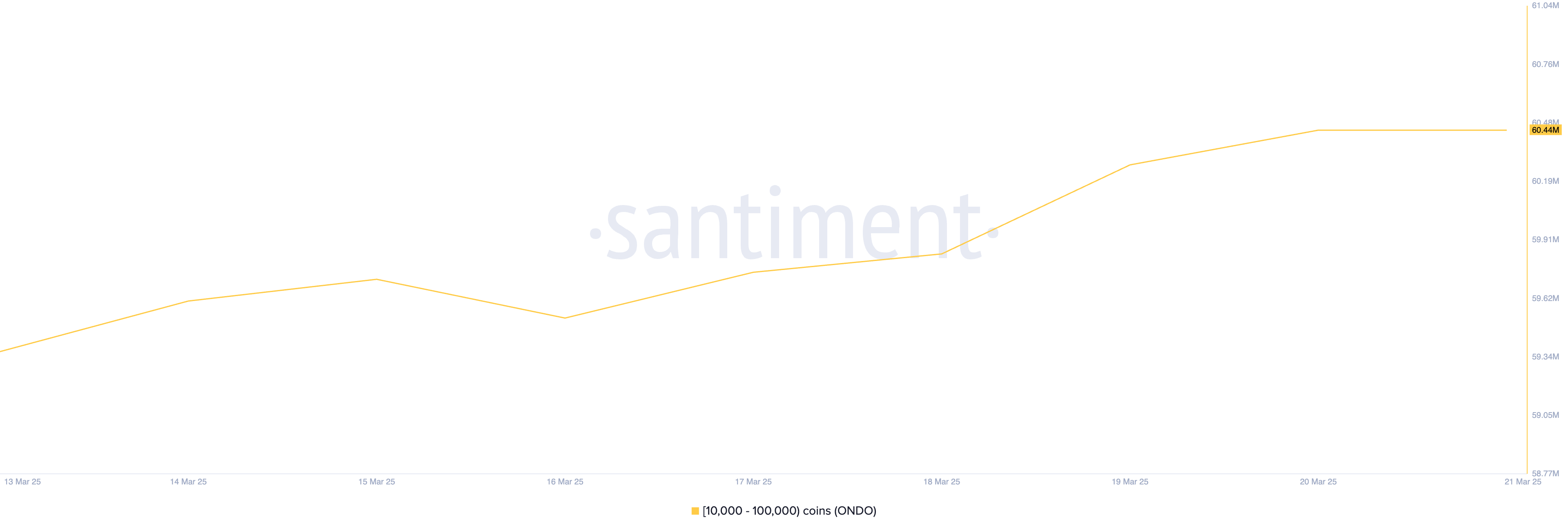 Deze week staat de real-world asset-based (RWA) token ONDO ook op de lijst van crypto whales. Volgens Santiment hebben whales die tussen de 10.000 en 100.000 ONDO bezitten, in de afgelopen zeven dagen 1,08 miljoen tokens gekocht.