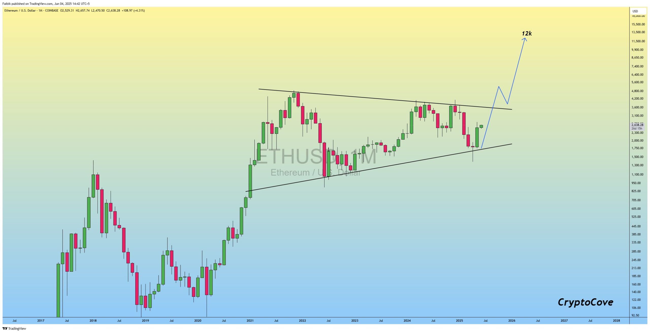 Op het moment van schrijven handelt ETH op $2.637, een stijging van 1% in de afgelopen 24 uur. Volgens trader CryptoFaibik beweegt ETH binnen een meerjarige symmetrische driehoekspatroon dat zich sinds begin 2021 heeft ontwikkeld.