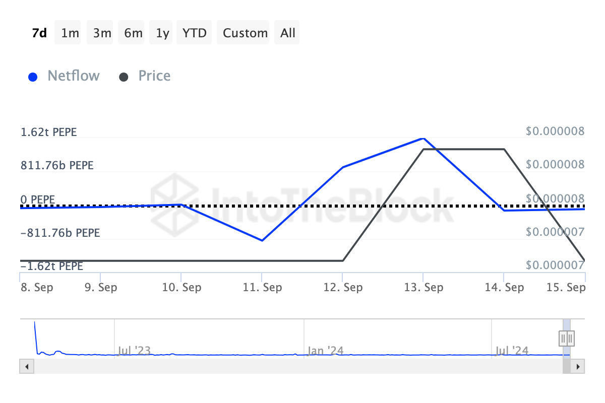 Een negatieve netflow duidt doorgaans op meer distributie dan accumulatie, terwijl een stijging juist wijst op toenemende accumulatie. Bij PEPE ligt de situatie echter iets anders.