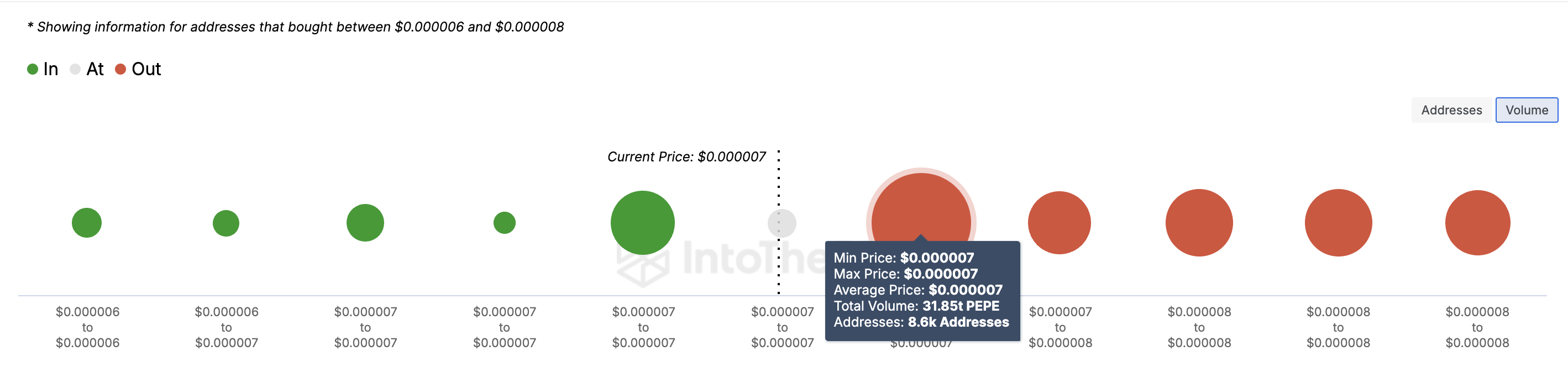 In het geval van PEPE lijkt het volume onder $0,0000069 onvoldoende om sterke steun te bieden. Als houders in de weerstandszone besluiten te verkopen, kan de koers verder corrigeren.