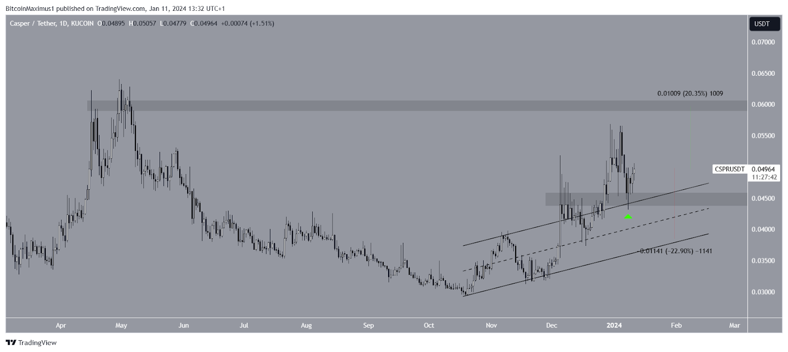 Ondanks deze CSPR koers verwachting, zou een terugval in het kanaal kunnen leiden tot een daling van 23%. Dit zou de prijs naar de $0,04-steuntrendlijn kunnen duwen.