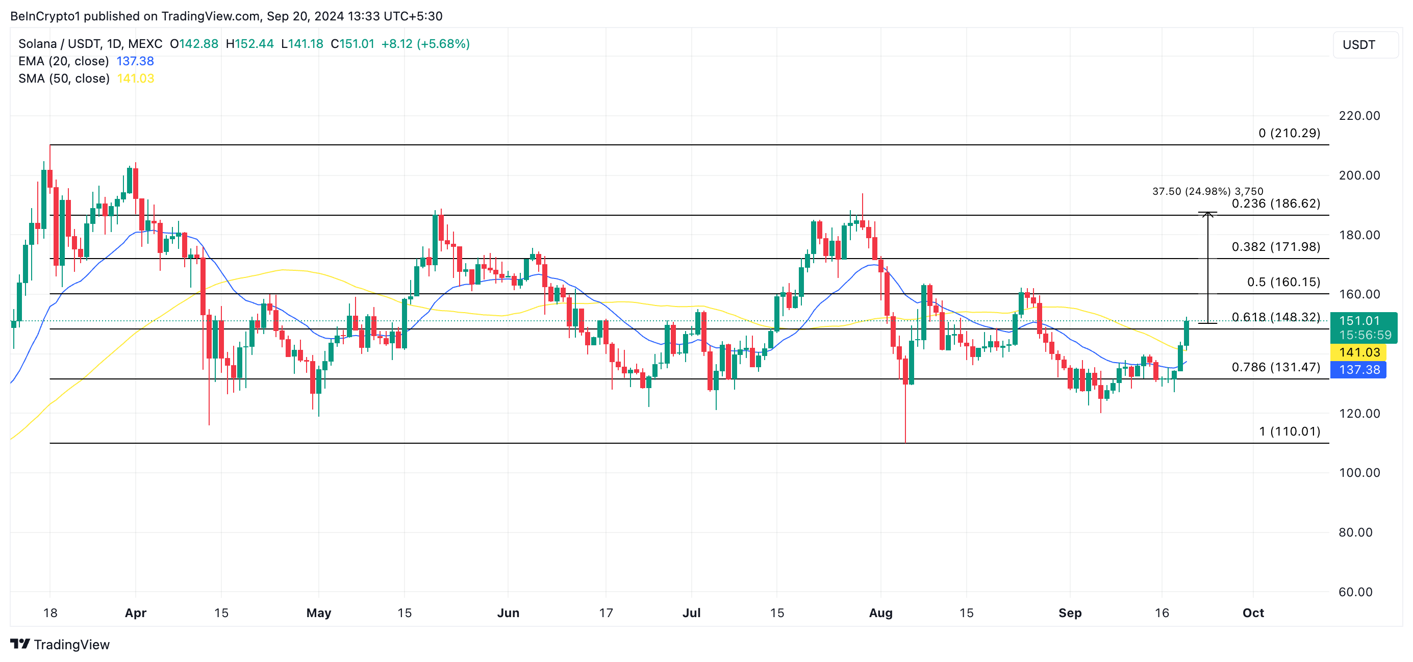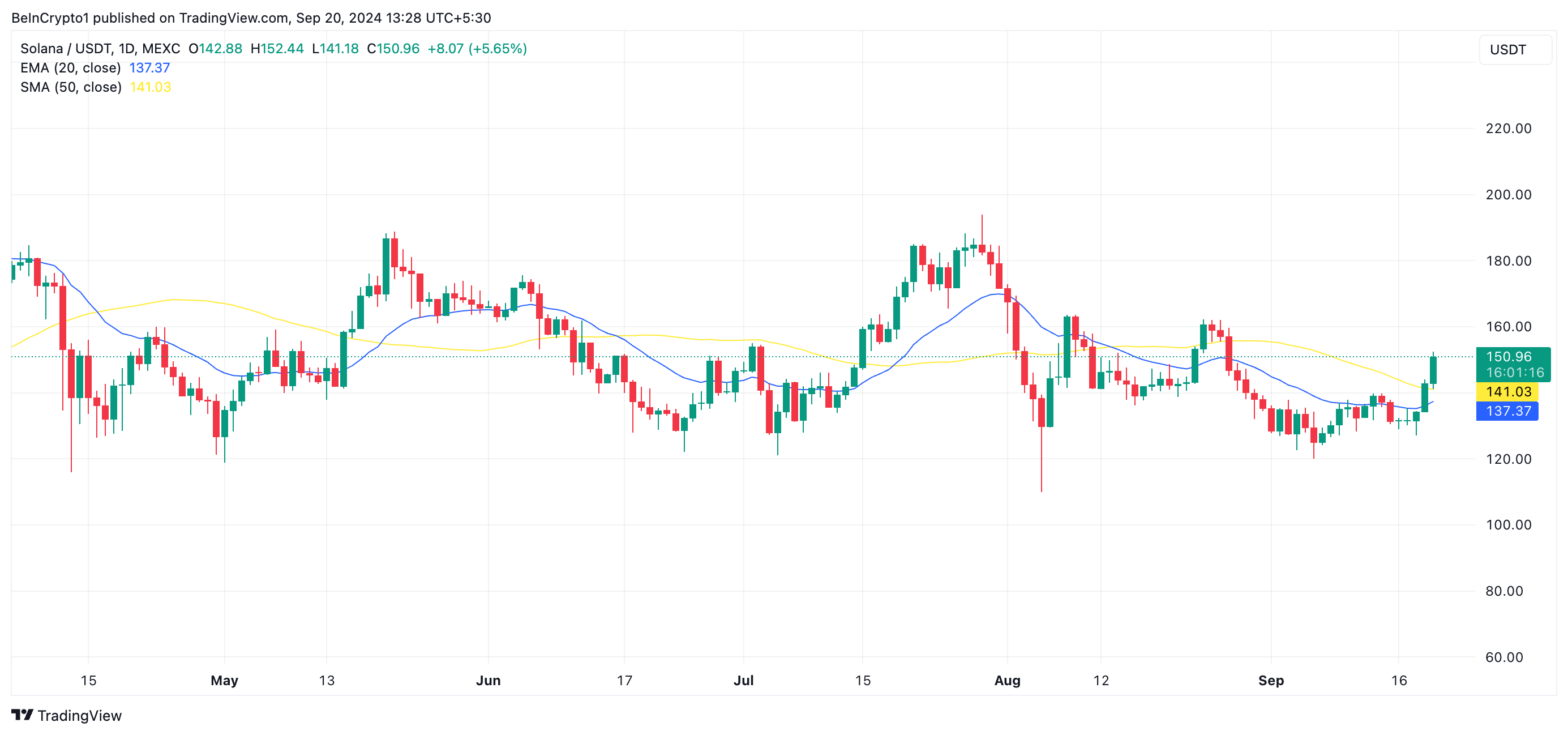 SponsoredSOL koers verwachting: coin kan weerstand bij $160 doorbreken