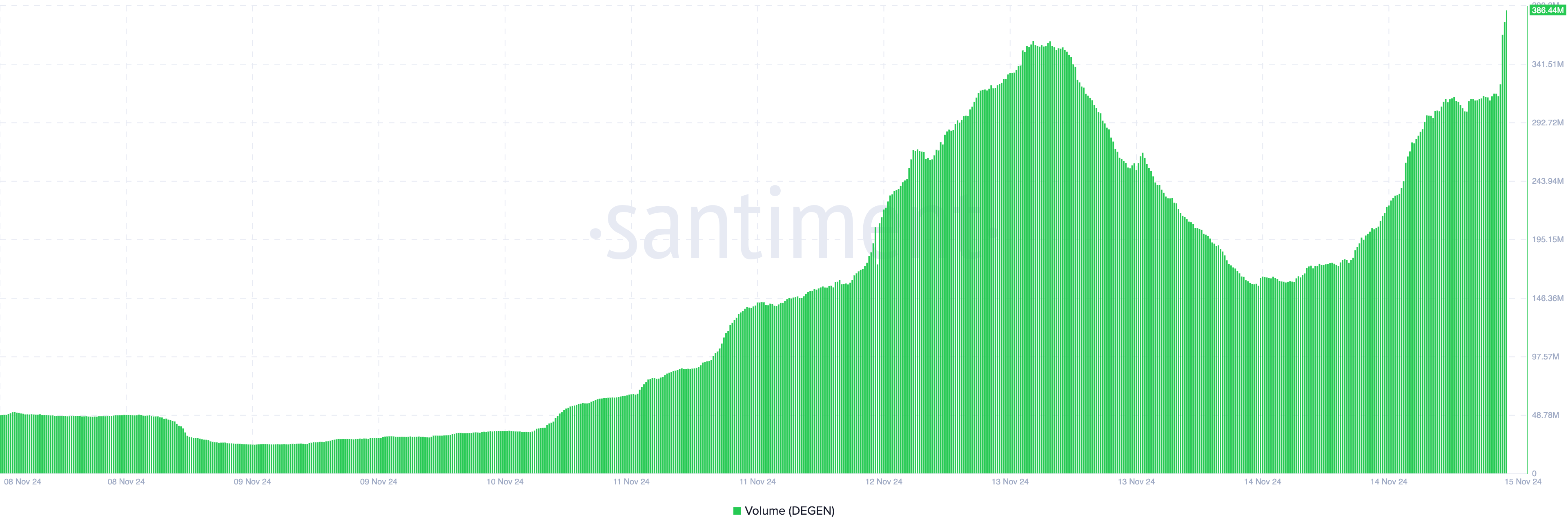 SponsoredNaarmate de koers van DEGEN steeg, steeg ook het handelsvolume. Volgens Santiment klom de waarde van de meme coin binnen enkele minuten met 131%.