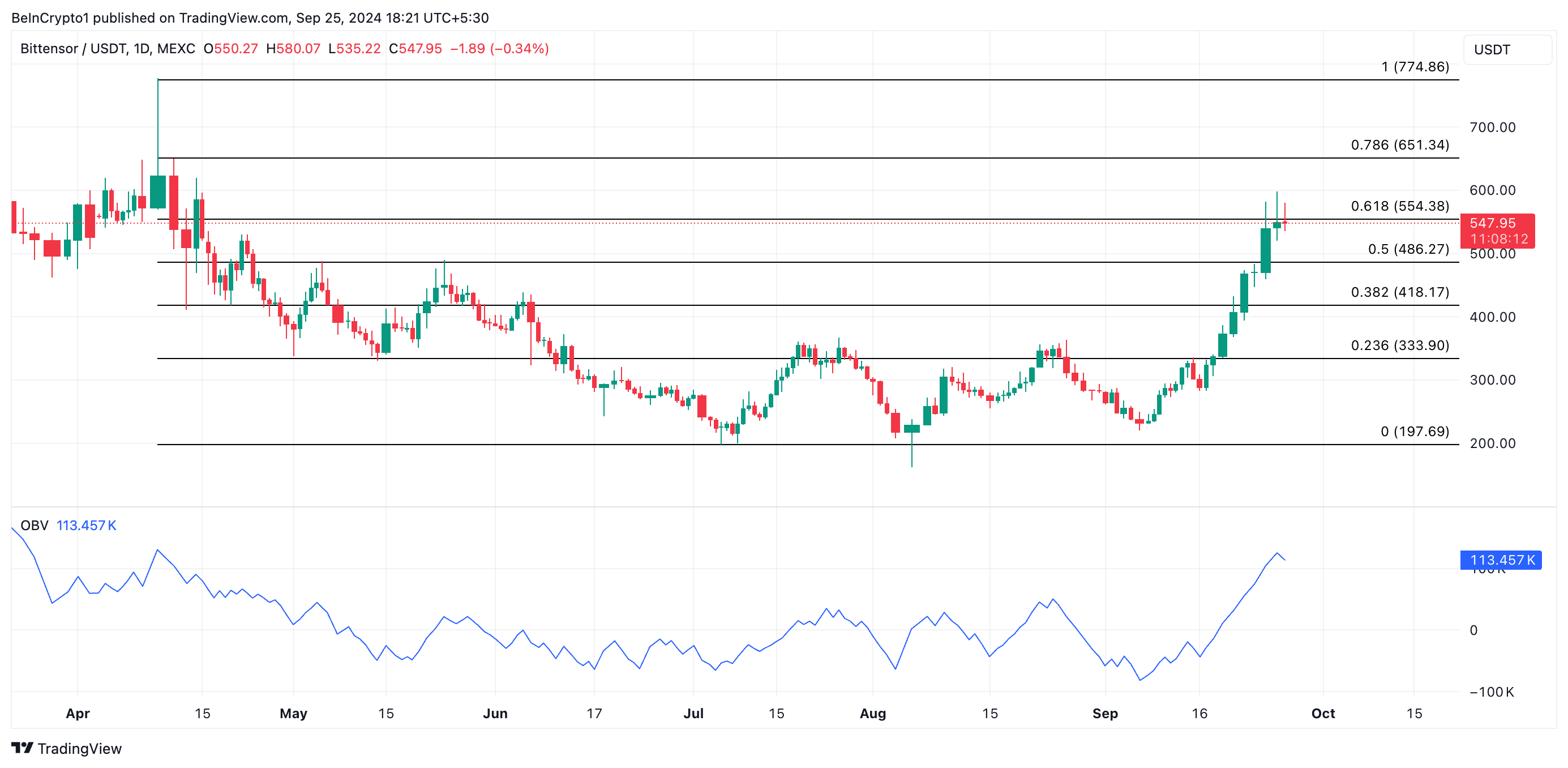 SponsoredTAO geniet momenteel van een sterke bullish bias, zoals blijkt uit zijn stijgende on-balance volume (OBV). Een stijgend OBV geeft aan dat kopers de markt domineren, wat suggereert dat de koopdruk hoog is. Dit duidt erop dat handelaren en investeerders vertrouwen hebben in het vermogen van de cryptomunt om verder in waarde te stijgen.
