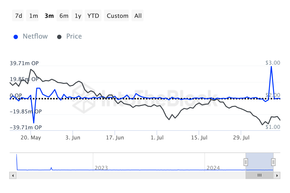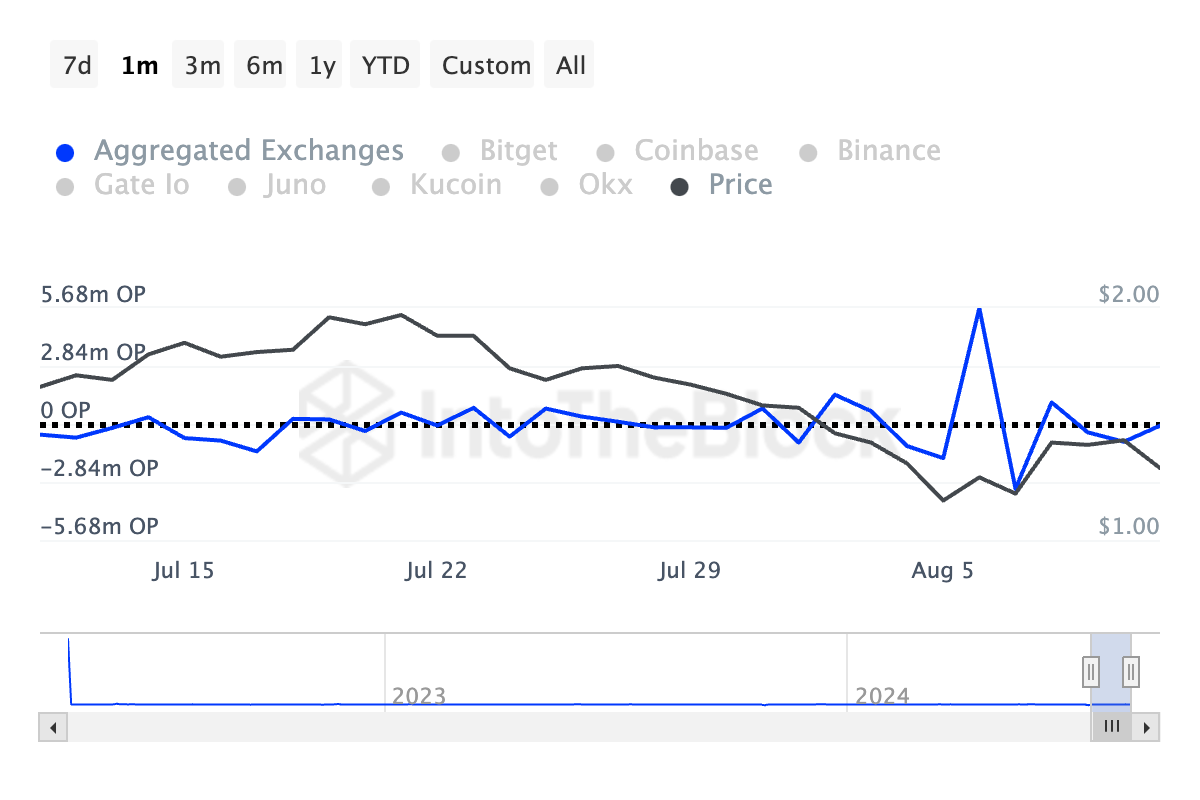 Data van IntoTheBlock toont aan dat er in de afgelopen maand 585.000 OP tokens naar beurzen zijn gestuurd, wat bijdraagt aan aanzienlijke verkoopdruk. Deze instroom heeft de prijs van OP in de laatste 30 dagen met dubbele cijfers doen dalen.