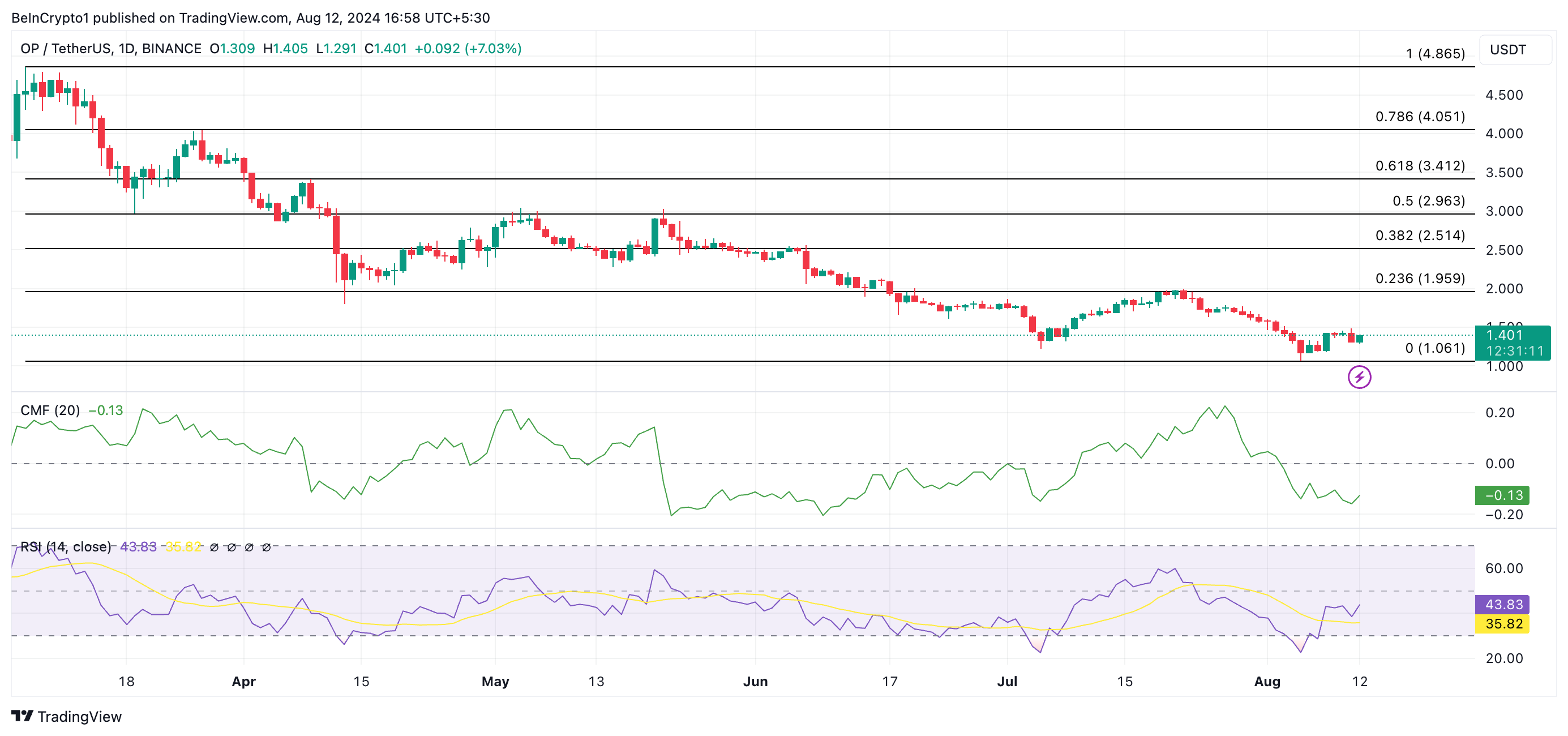 Bovendien is OP’s Chaikin Money Flow (CMF), die de instroom en uitstroom van kapitaal in zijn markt volgt, momenteel negatief. Met een CMF-waarde van -0,13 op dit moment, ervaart de OP-markt een uitstroom van liquiditeit, wat blijft zorgen voor neerwaartse druk op zijn prijs.