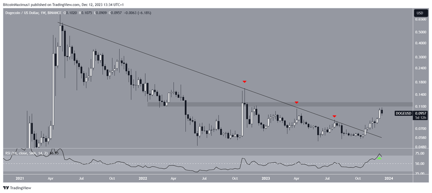 De technische analyse van het wekelijkse tijdsframe laat zien dat de DOGE koers een dalende weerstandstrendlijn volgde sinds de all-time high in mei 2021. Na verschillende mislukte pogingen (rode pijltjes) brak DOGE in oktober 2023 uit de langetermijntrendlijn.