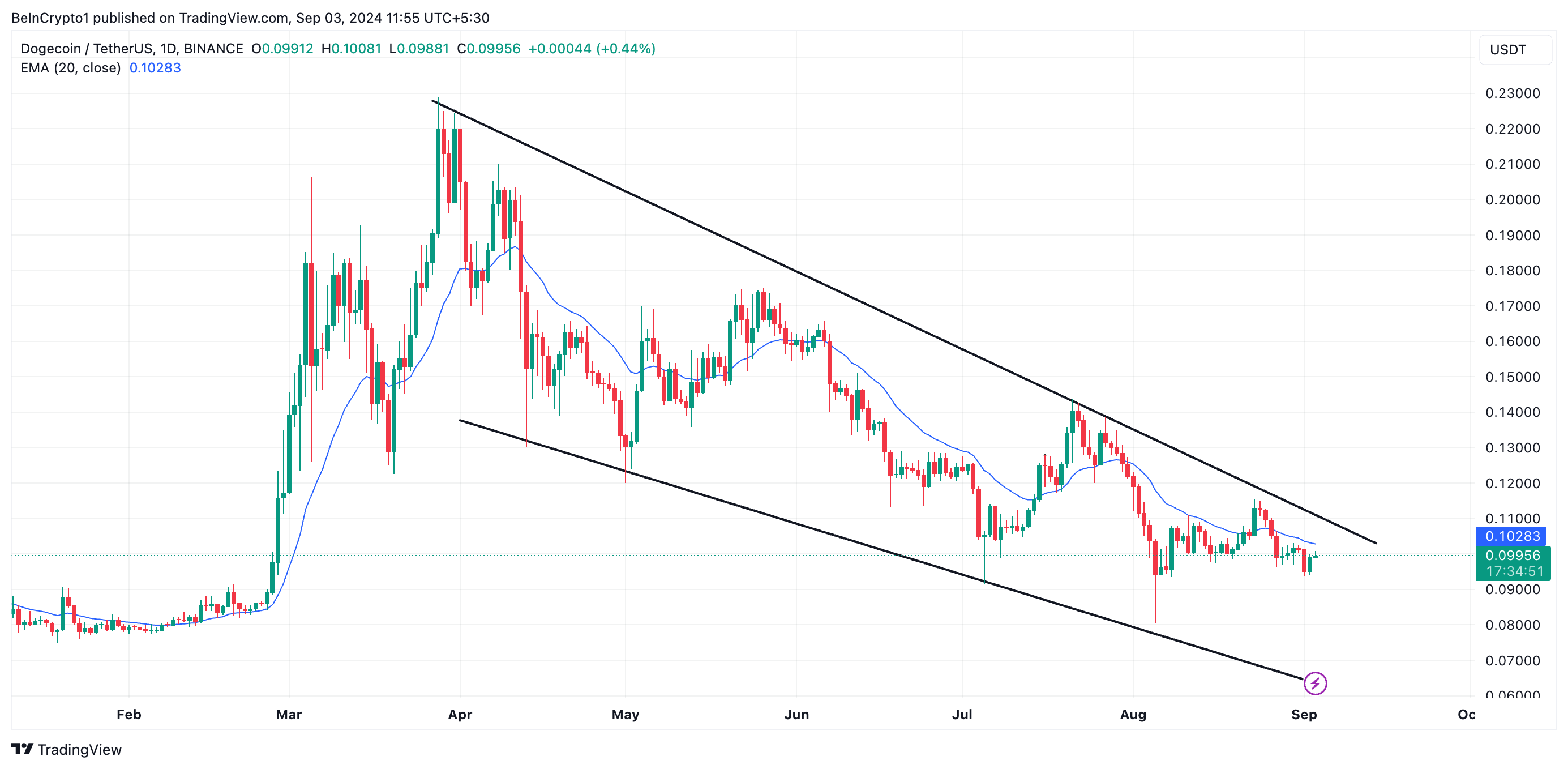 Gegevens van DOGE’s eendaagse grafiek laten zien dat de meme coin sinds maart binnen een dalend wigpatroon beweegt. Dit patroon wordt gekenmerkt door twee neerwaarts hellende trendlijnen, waarbij de bovenste lijn als weerstand dient en de onderste als steun.