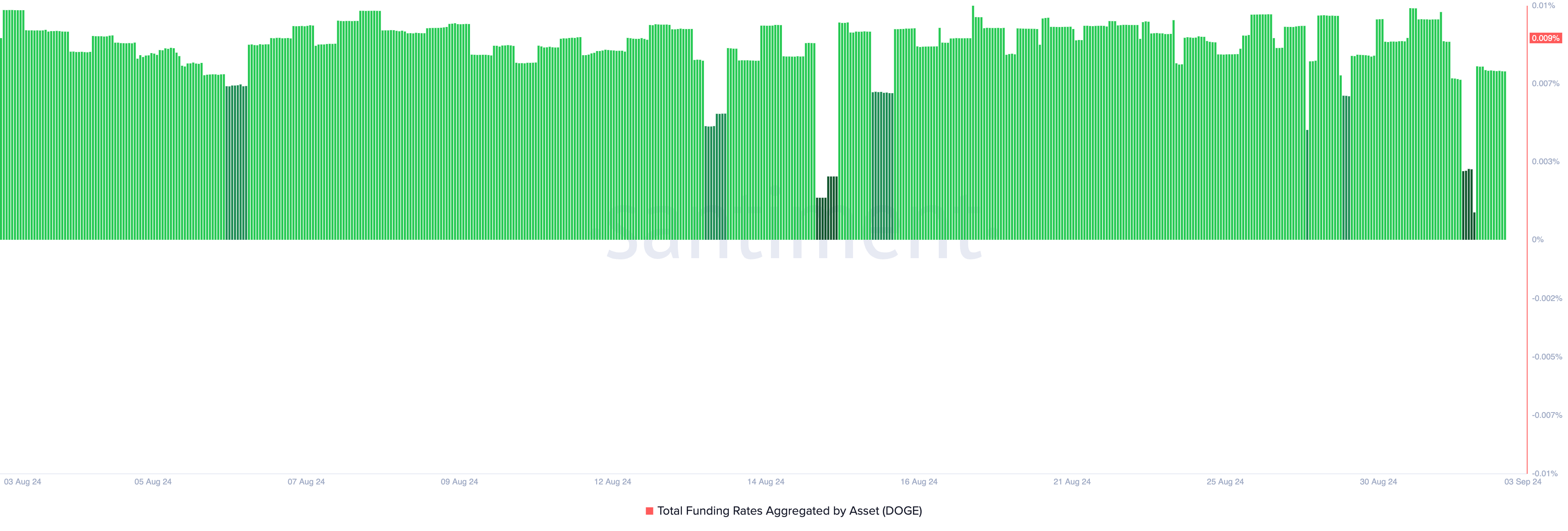 Ondanks de koersproblemen van DOGE hebben futureshandelaren voornamelijk longposities ingenomen, zoals blijkt uit de consequent positieve funding rates. Funding rates zorgen ervoor dat de prijs van eeuwigdurende futurescontracten in lijn blijft met de spotprijs.