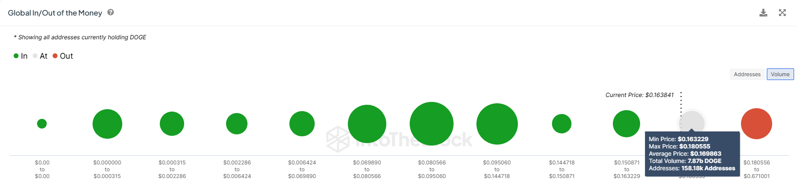 Het optimisme van investeerders wordt gevoed door de $1,28 miljard aan winsten die ze zullen zien. Volgens de Global In/Out of the Money (GIOM)-indicator werden er ongeveer 7,87 miljard DOGE gekocht tussen $0,16 en $0,18. Dit aanbod zou binnenkort winstgevend kunnen worden.
