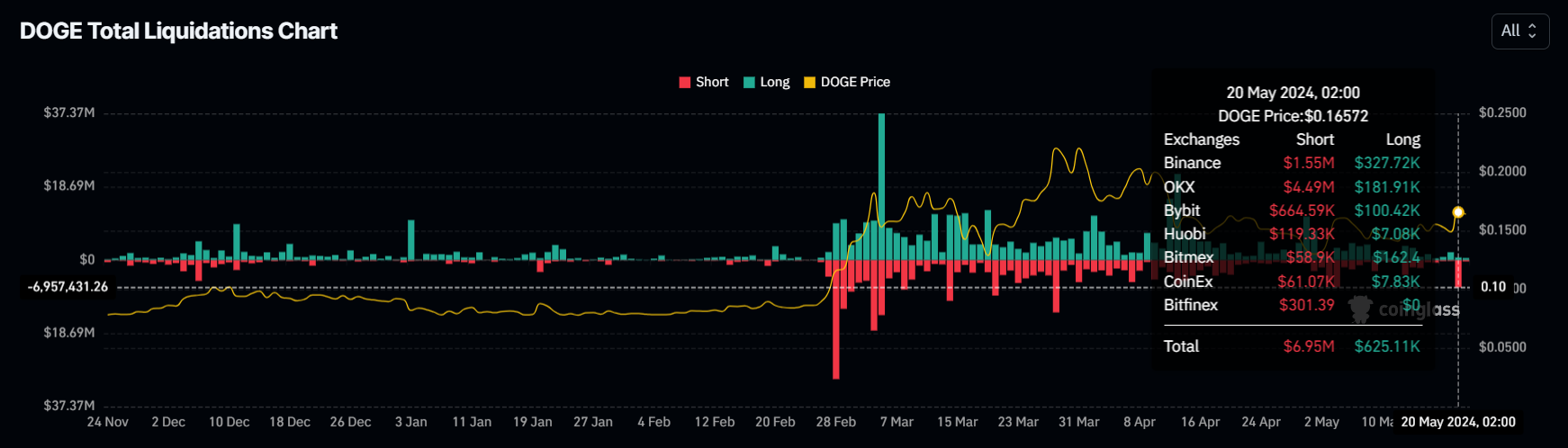 De Dogecoin koers steeg de afgelopen dag met 11% toen de hele cryptomarkt stijgingen zag. Dit bracht de meme coin naar $0,163 . Dit leidde ertoe dat de traders die snakten naar een koersdaling hun geld verloren, zoals blijkt uit de short liquidaties ter waarde van bijna $7 miljoen.