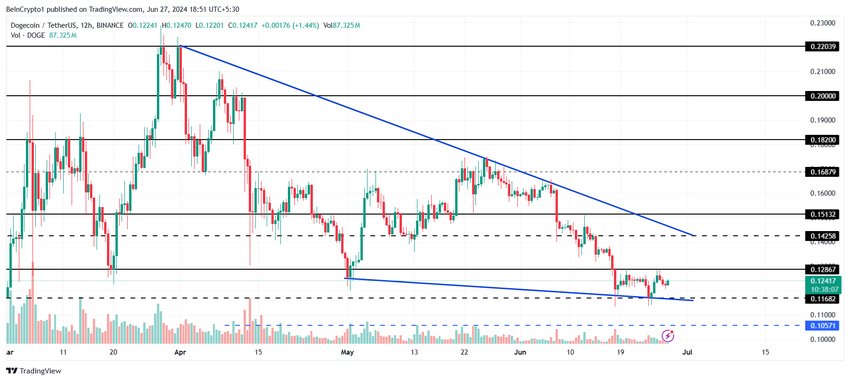 Dekoers van Dogecoin bevindt zich op het moment van schrijvenbinnen een dalende wig op $ 0,124. Een dalende wig is een bullish technisch chartpatroon gevormd door convergerende trendlijnen die naar beneden hellen. Het duidt meestal op een potentiële omkering of breakout naar boven.