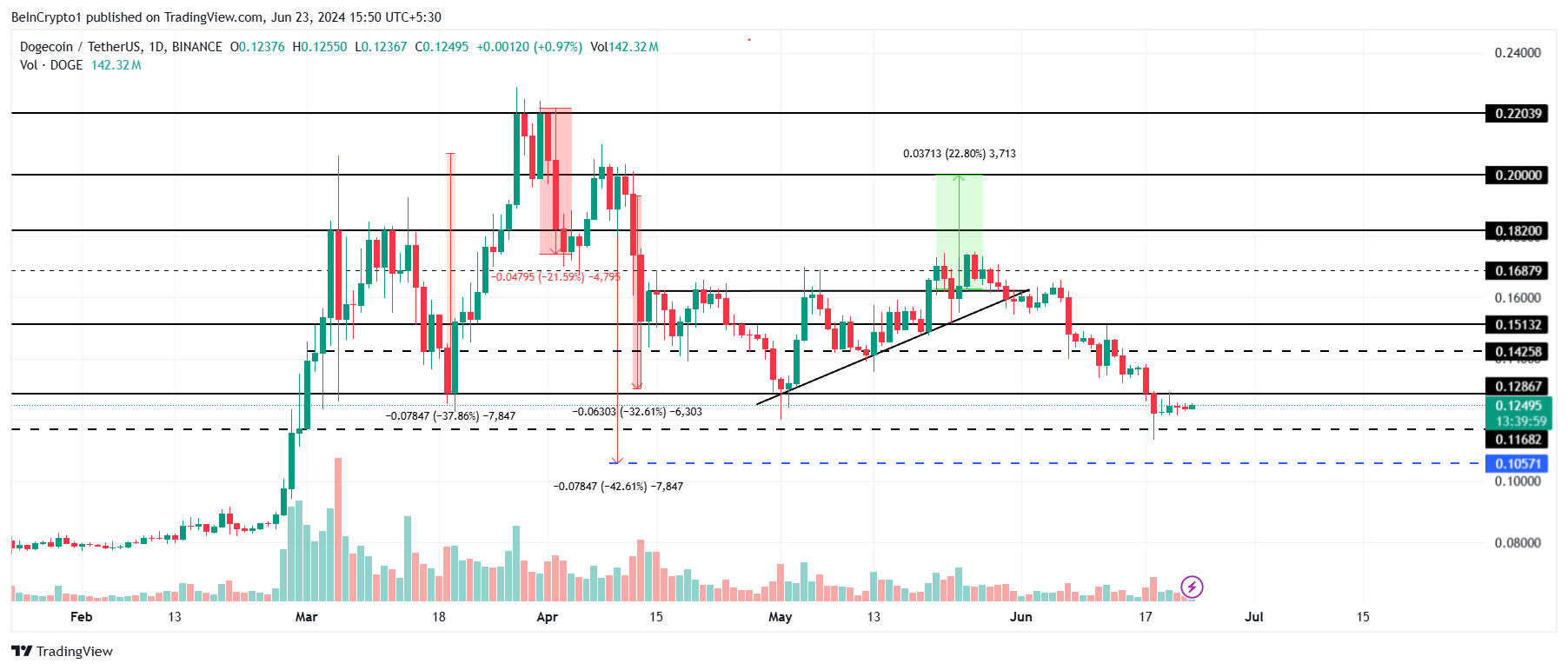 De Dogecoin (DOGE) koers heeft de afgelopen weken een teleurstellende run gehad na het falen van het bullish stijgende driehoekpatroon.