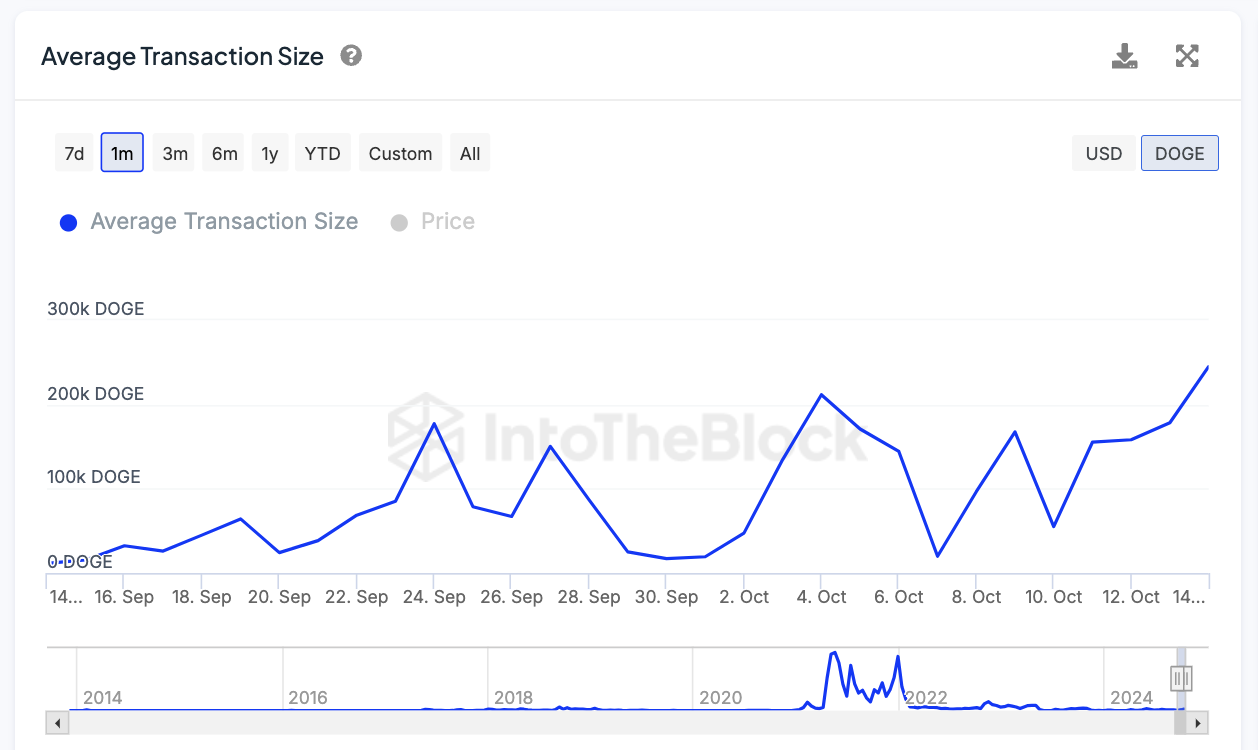 Dogecoin (DOGE) heeft de afgelopen dagen een opvallende stijging in de gemiddelde transactiegrootte gezien, van 55.000 op 10 oktober naar 244.000 op 14 oktober. Deze toename wijst op groeiende interesse in transacties met hogere bedragen, wat erop kan duiden dat grotere marktspelers actief worden in DOGE.