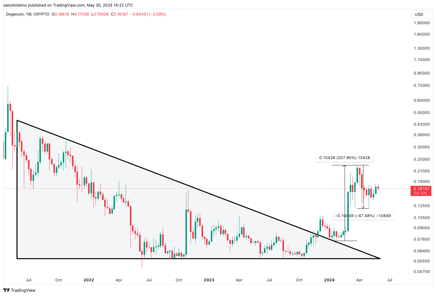 Na de all-time high van $ 0,73905 in mei 2021, kwam Dogecoin in een bear market terecht en vormde een dalend driehoekspatroon. In januari 2024 brak Dogecoin uit dit patroon met een koersstijging van 207,85%. Zoals te zien was in eerdere cycli, trok de koers van DOGE met 47,48% terug.
