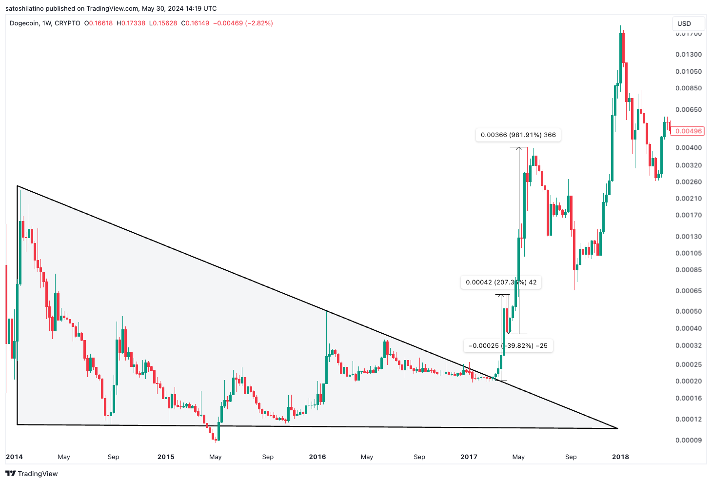 In maart 2017 brak Dogecoin uit dit dalende driehoekspatroon, wat resulteerde in een stijging van 207,35%. Na deze opleving onderging DOGE een 39,82% retracement voordat het met een indrukwekkende 981,91% omhoogschoot.