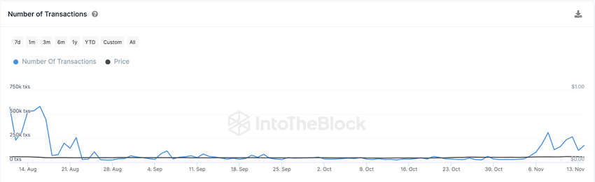 Het aantal DOGE transacties bereikte een piek van drie maanden van 307.810 op 8 november. Ondanks de koersdaling hebben Dogecoin traders de 100.000 bevestigde transacties in de laatste 10 opeenvolgende dagen overschreden, een prestatie die het slechts één keer bereikte in de voorgaande 60 dagen samen.