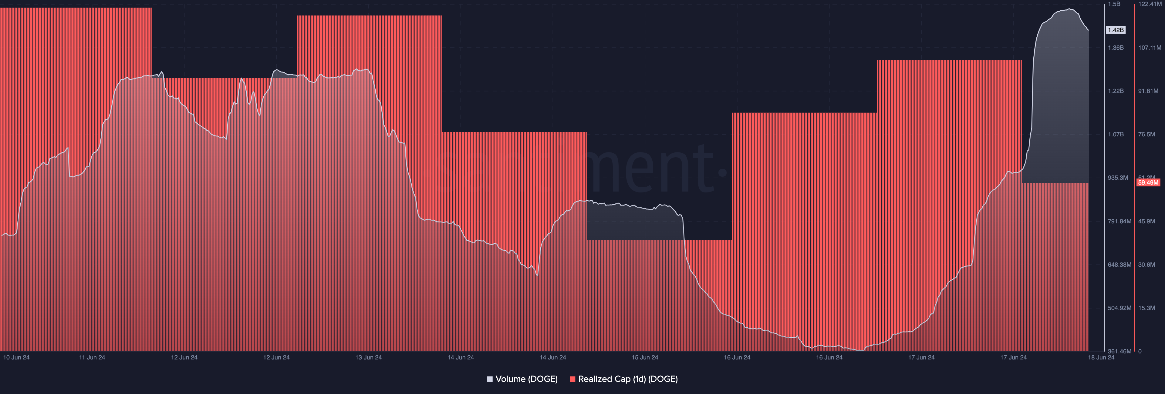 Laten we nu eens kijken naar het koerspotentieel van de coin. Vanuit een on-chain perspectief analyseert BeInCrypto het volume en de Realized Cap van Dogecoin.