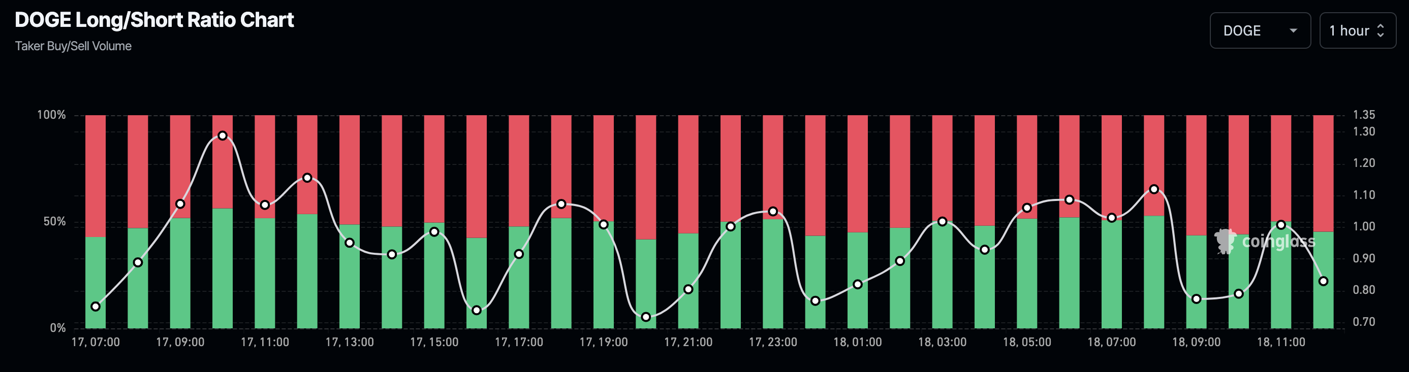 Sponsored SponsoredAls de waarde van deze indicator boven 1 ligt, betekent dit dat traders optimistische verwachtingen hebben over een cryptocurrency. Omgekeerd betekent een waarde onder 1 dat de gemiddelde verwachtingen van traders somber zijn. De Long/Short Ratio van DOGE stond op het moment van schrijven op 0,82.