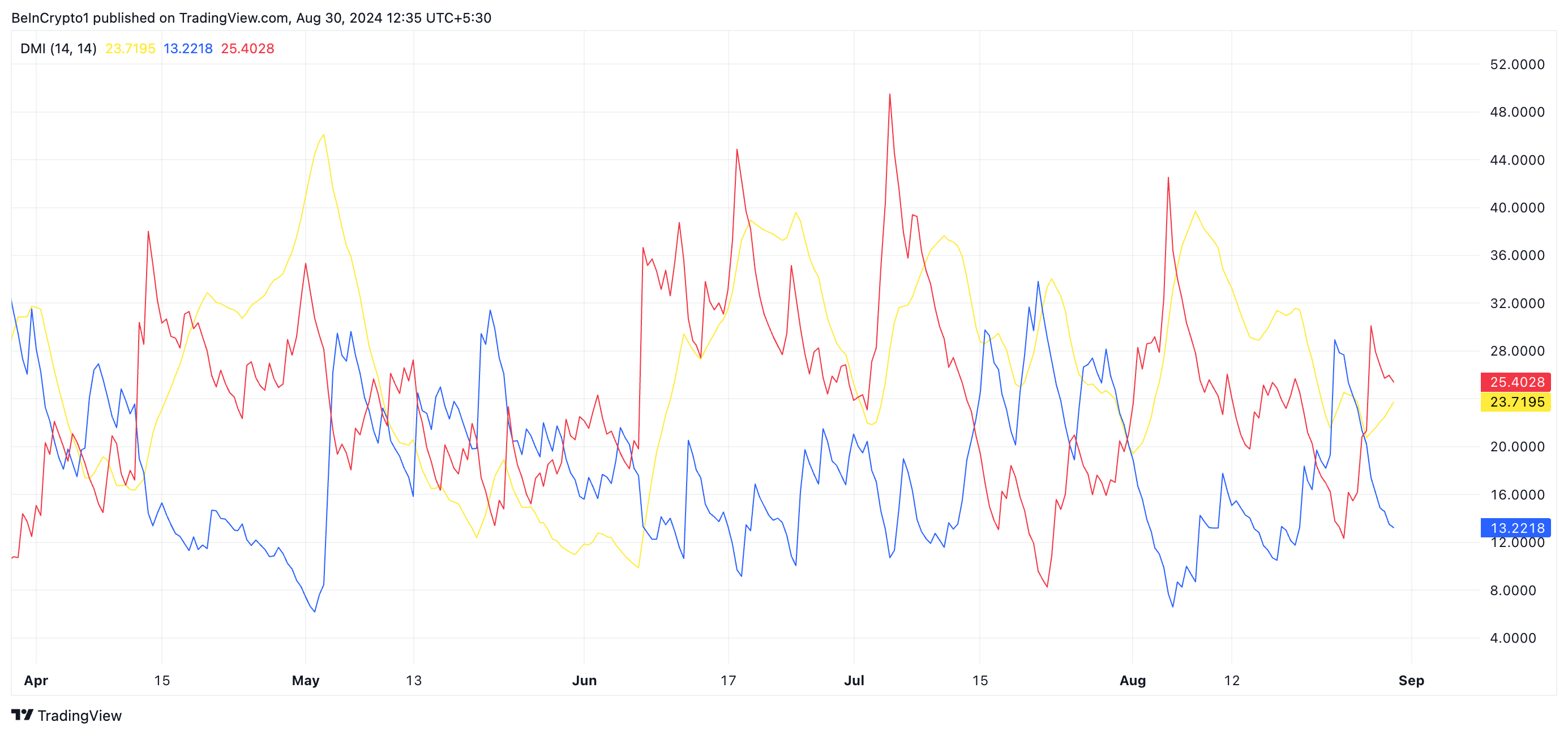 Bijvoorbeeld, de Directional Movement Index (DMI) van DOGE toont de positieve directionele indicator (+DI) in blauw onder de negatieve directionele indicator (-DI) in rood, wat wijst op aanhoudende bearish controle.