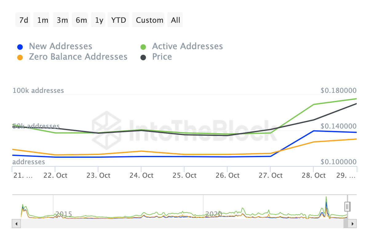 Bovendien heeft Dogecoin een opmerkelijke toename gezien in het aantal nieuwe en actieve adressen op de blockchain.
