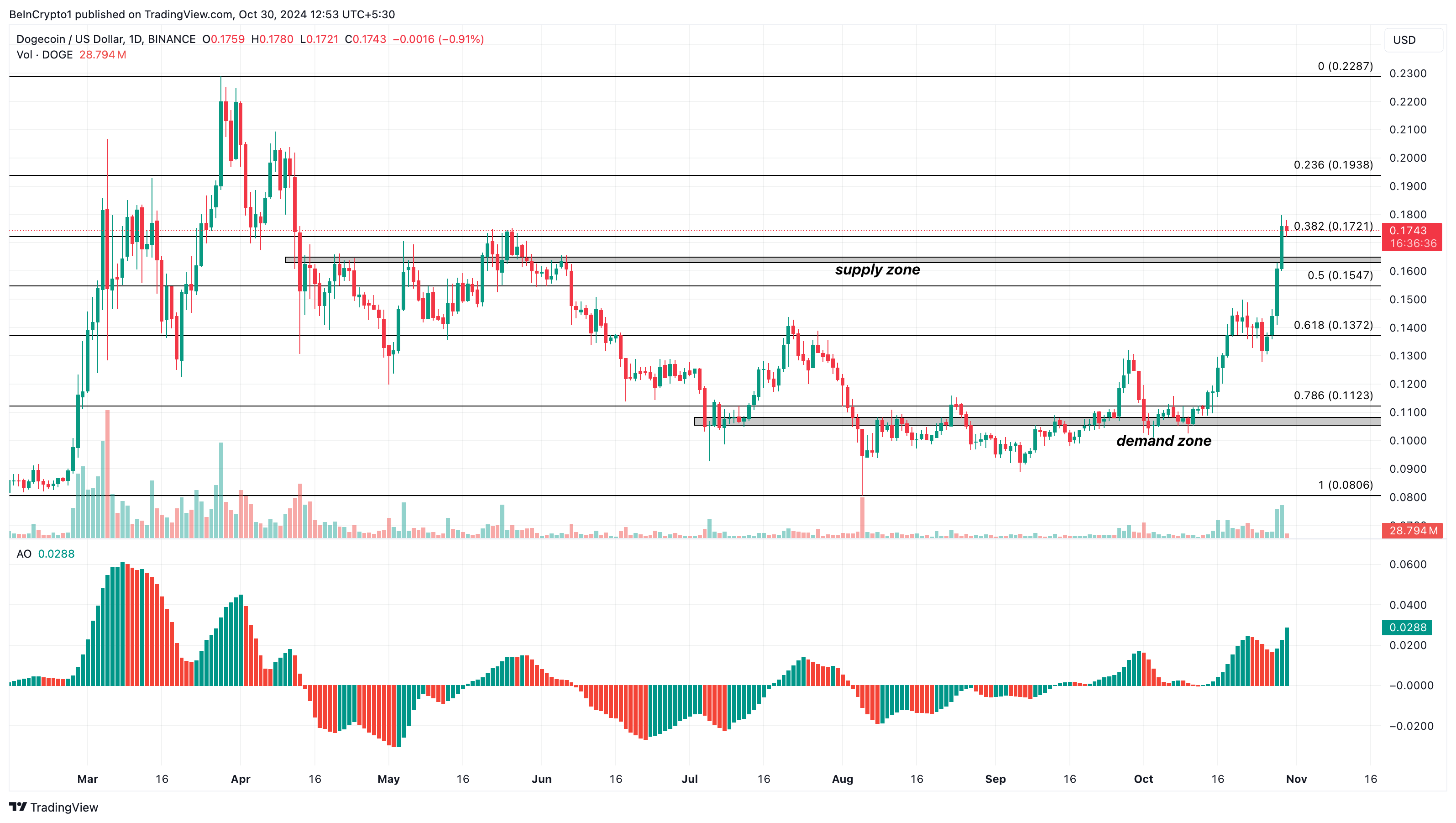 Op de dagelijkse grafiek is de Dogecoin koers gestegen boven de aanbodzone bij $0,16. Historisch gezien heeft de meme coin het moeilijk gevonden om deze weerstand te overtreffen. Zo werd DOGE bijvoorbeeld in april afgewezen op dit punt en daalde later naar $0,13.