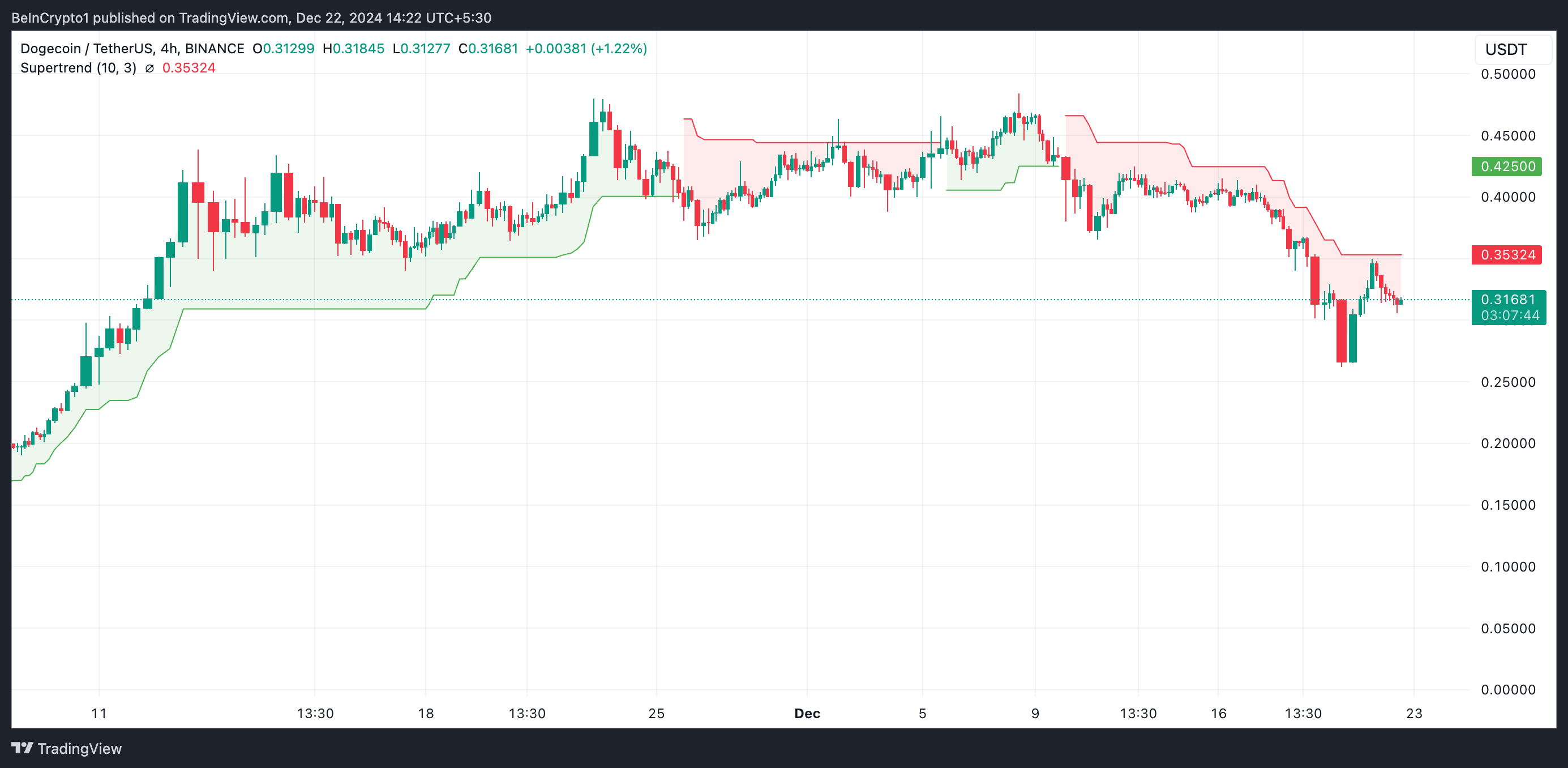 Bovendien bevestigen de bearish signalen van DOGE’s Super Trend Indicator de mogelijkheid van verdere dalingen. Op het moment van schrijven ligt de DOGE-koers onder de rode lijn van deze indicator.