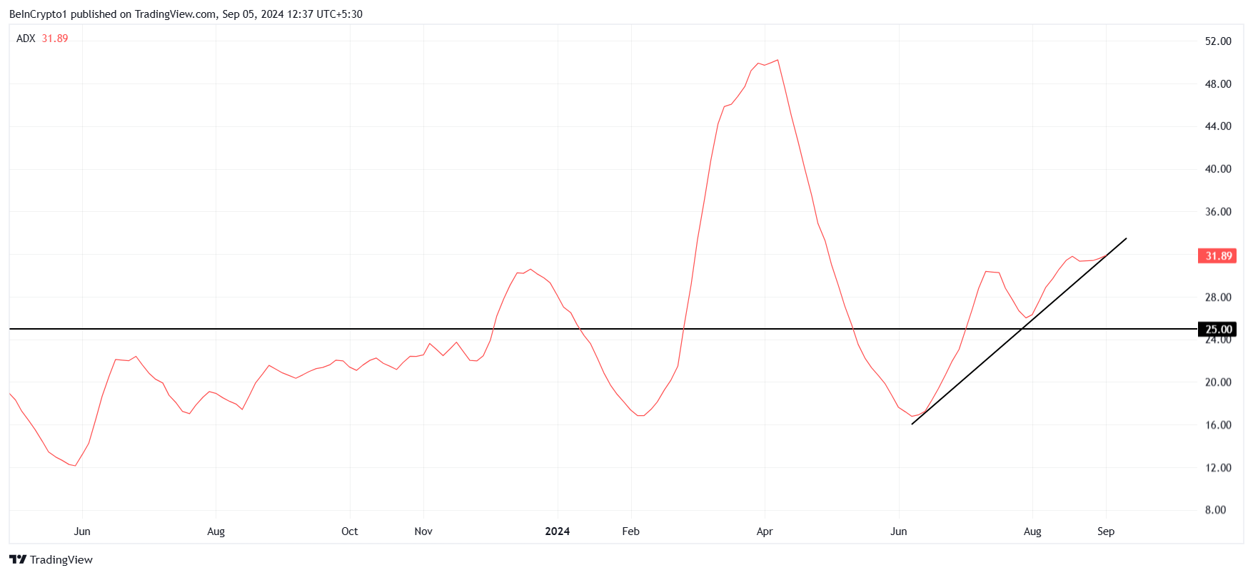 De koers van Dogecoin neigt steeds meer naar een bearish richting, waarbij technische indicatoren duiden op een voortzetting van de neerwaartse trend. Met name de Average Directional Index (ADX), een indicator die de sterkte van een trend meet, toont een significante stijging. Aangezien de ADX momenteel ruim boven de drempel van 25.0 ligt, wordt een sterke neerwaartse trend bevestigd, wat duidt op een mogelijke verdere daling in de DOGE koers.