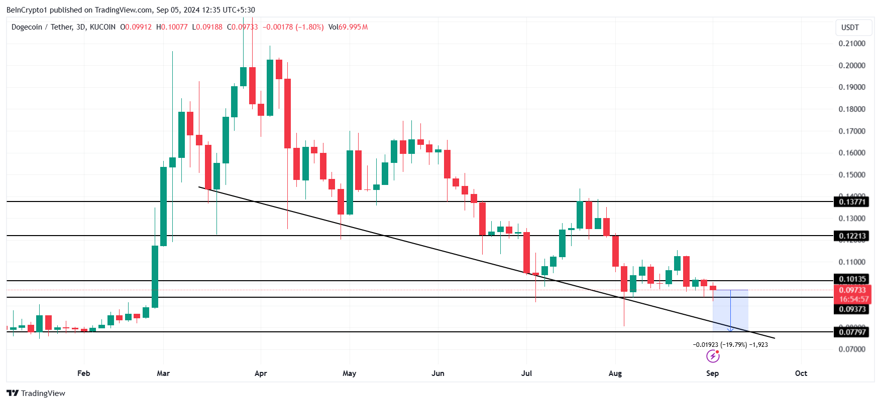 Als Dogecoin er niet in slaagt om boven de $0,093 te blijven, zal het waarschijnlijk de lagere trendlijn van de aanhoudende neerwaartse trend testen. Dit niveau ligt naar verwachting rond $0,077, wat neerkomt op een daling van 20% ten opzichte van de huidige prijs. Historisch gezien heeft $0,077 gediend als een sterke steunzone, maar een doorbraak onder dit niveau zou de neerwaartse trend aanzienlijk kunnen versnellen en mogelijk leiden tot verdere verliezen voor DOGE.