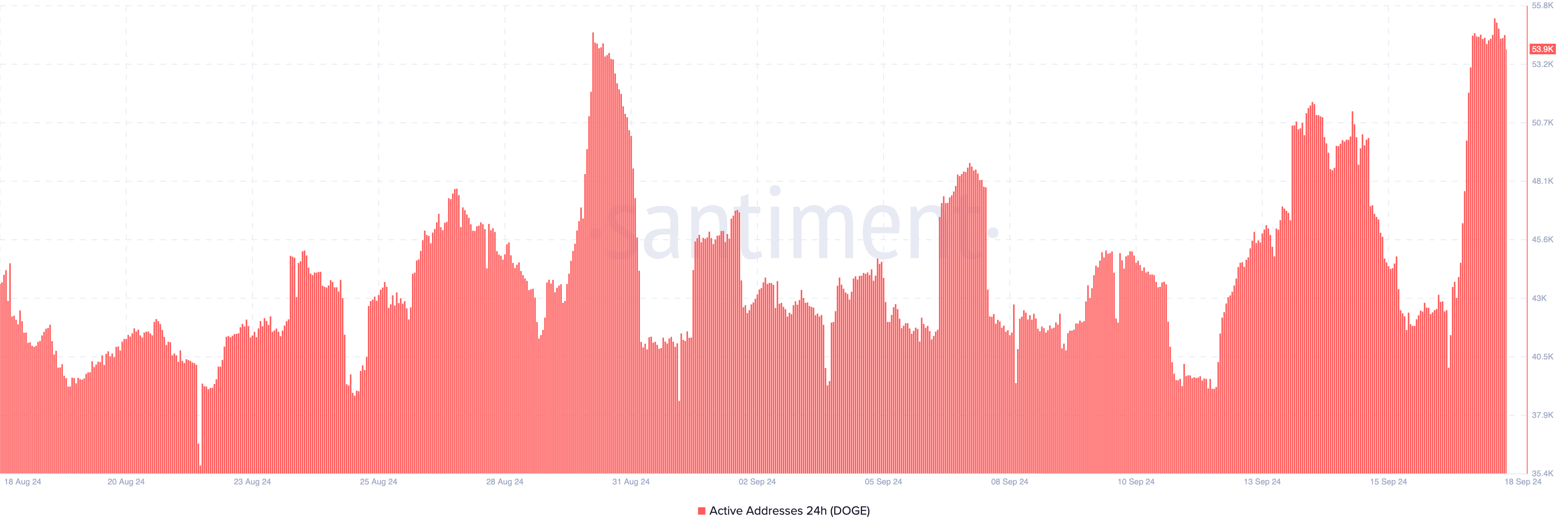 Interessant is dat de betrokkenheid van gebruikers met Dogecoin ook toeneemt. Gegevens van Santiment tonen aan dat actieve adressen 53.900 hebben bereikt, het hoogste sinds half augustus.