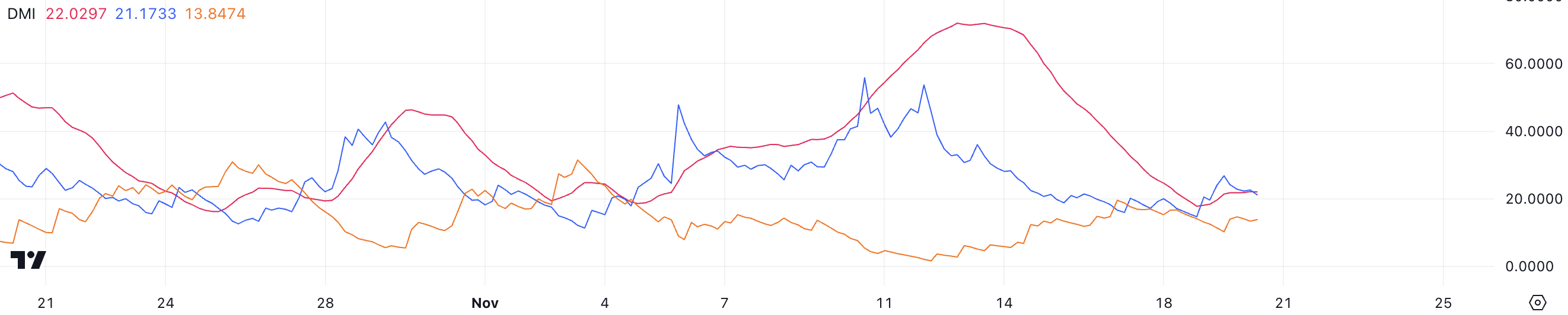 De ADX meet de sterkte van een trend, met waarden boven 25 die een sterke trend signaleren en waarden onder 20 die een zwakke of niet-bestaande trend aangeven. DOGE’s D+ staat op 21,17, wat bullish druk vertegenwoordigt, terwijl D- op 13,84 staat, wat bearish druk weerspiegelt.