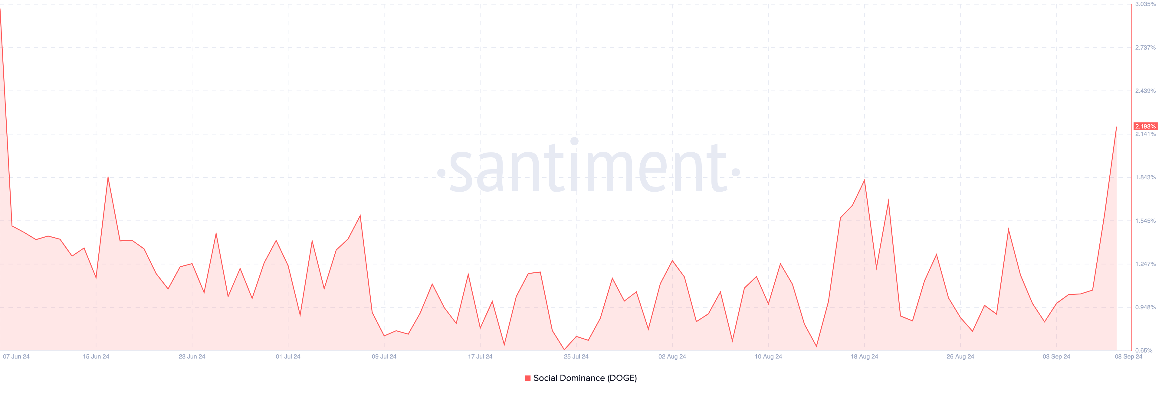 Vanuit een on-chain perspectief heeft Musks recente actie een opmerkelijke stijging in de sociale dominantie van de cryptocurrency veroorzaakt. Deze piek impliceert een toename in de actieve discussie rondom DOGE.