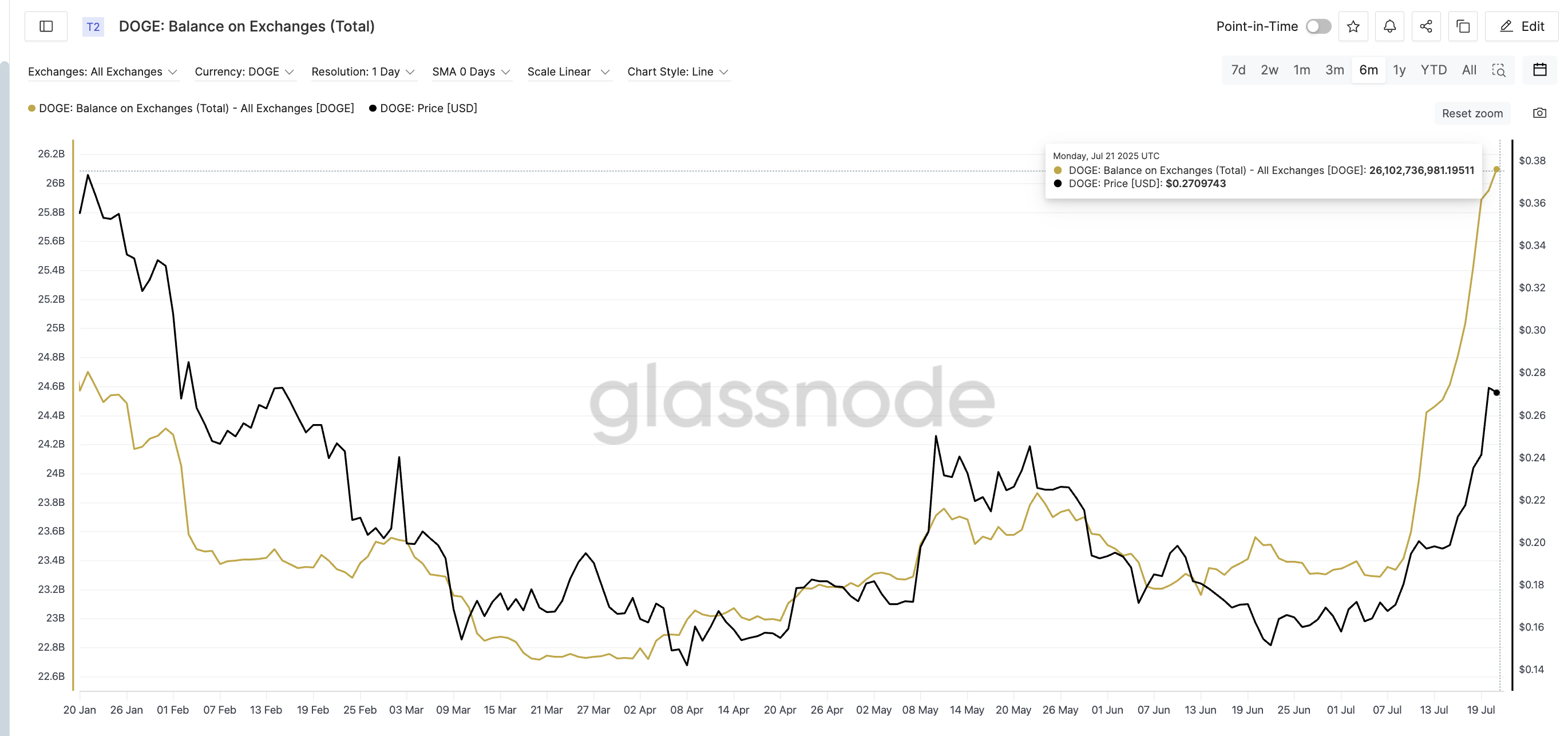 Een van de grootste waarschuwingssignalen is de toename van Dogecoin-balansen op exchanges. Op 21 juli stond er meer dan 26,1 miljard DOGE op gecentraliseerde exchanges, het hoogste niveau in zes maanden. Bij een koers van $0,27 vertegenwoordigt dit meer dan $7 miljard aan DOGE die klaarstaat om te bewegen.