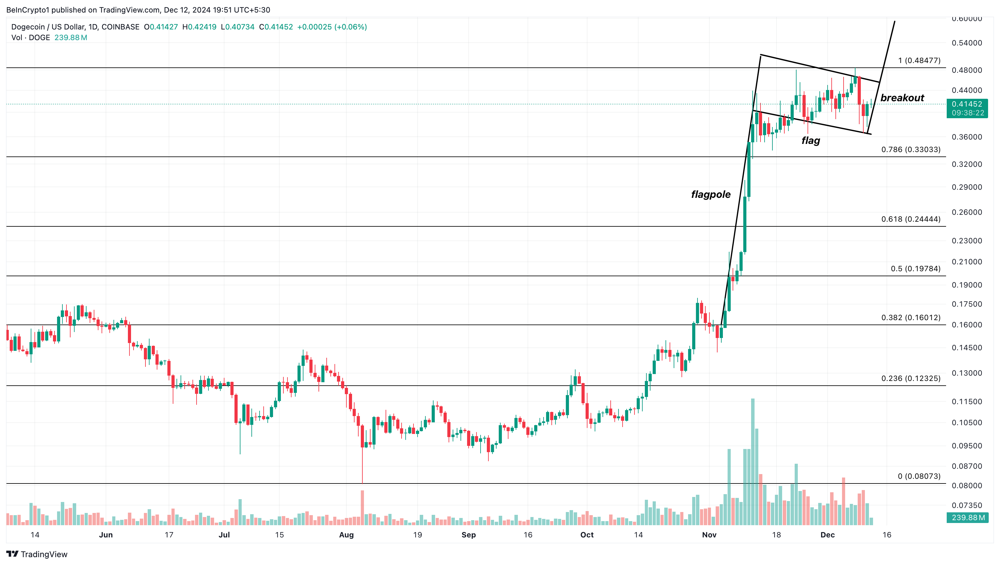 Technisch gezien toont de dagelijkse DOGE/USD-grafiek de vorming van een bull flag. Een bull flag is een patroon dat wordt gekenmerkt door twee rally’s, gescheiden door een korte consolidatieperiode.