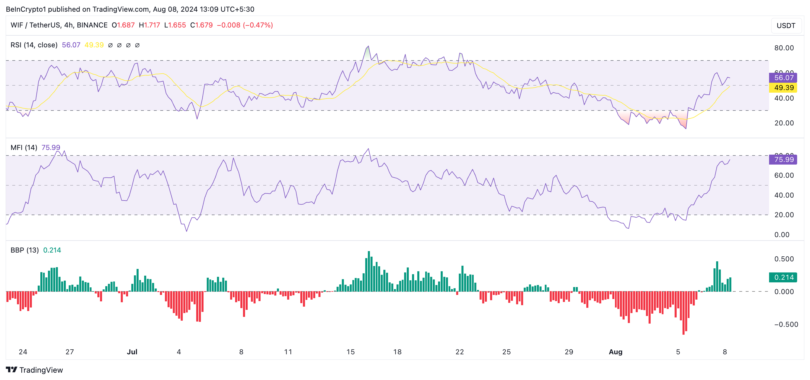 Op het moment van schrijven zijn de belangrijkste momentumindicatoren van de meme coin stijgend boven hun respectievelijke 50-neutrale lijnen. De Relative Strength Index (RSI) van WIF is 56,07, terwijl zijn Money Flow Index (MFI) 75,99 is.