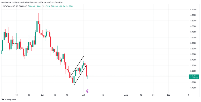 Dogwifhat heeft in de afgelopen 24 uur een koersdaling van 13% meegemaakt. Deze tweecijferige koersdaling volgde op enkele dagen van rally, wat leidde tot de vorming van een stijgend kanaal op een dagelijkse grafiek.