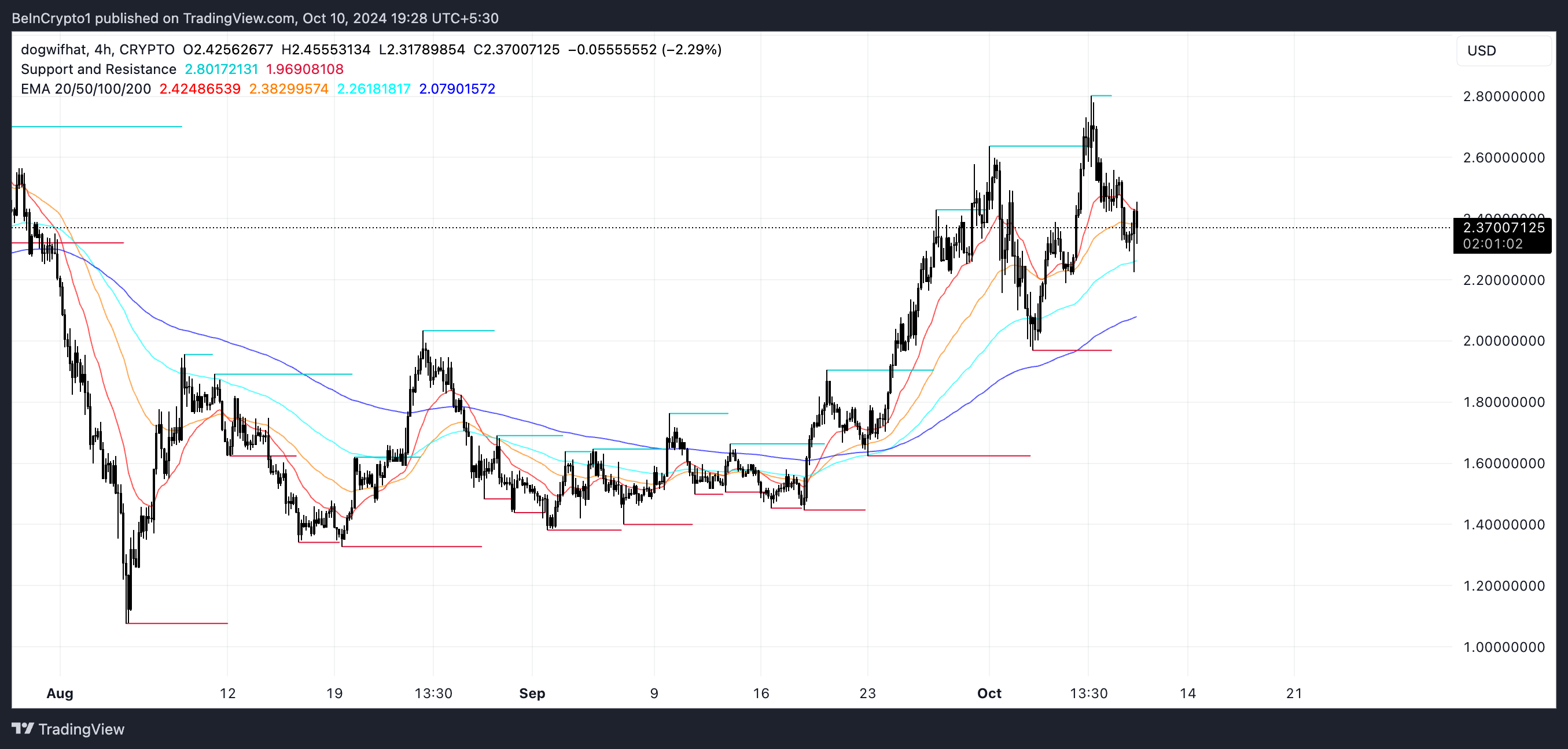 Dogwifhat (WIF) is de afgelopen 30 dagen met 42% gestegen, maar er blijft onzekerheid over het vasthouden van dit momentum en het opnieuw bereiken van $3.
