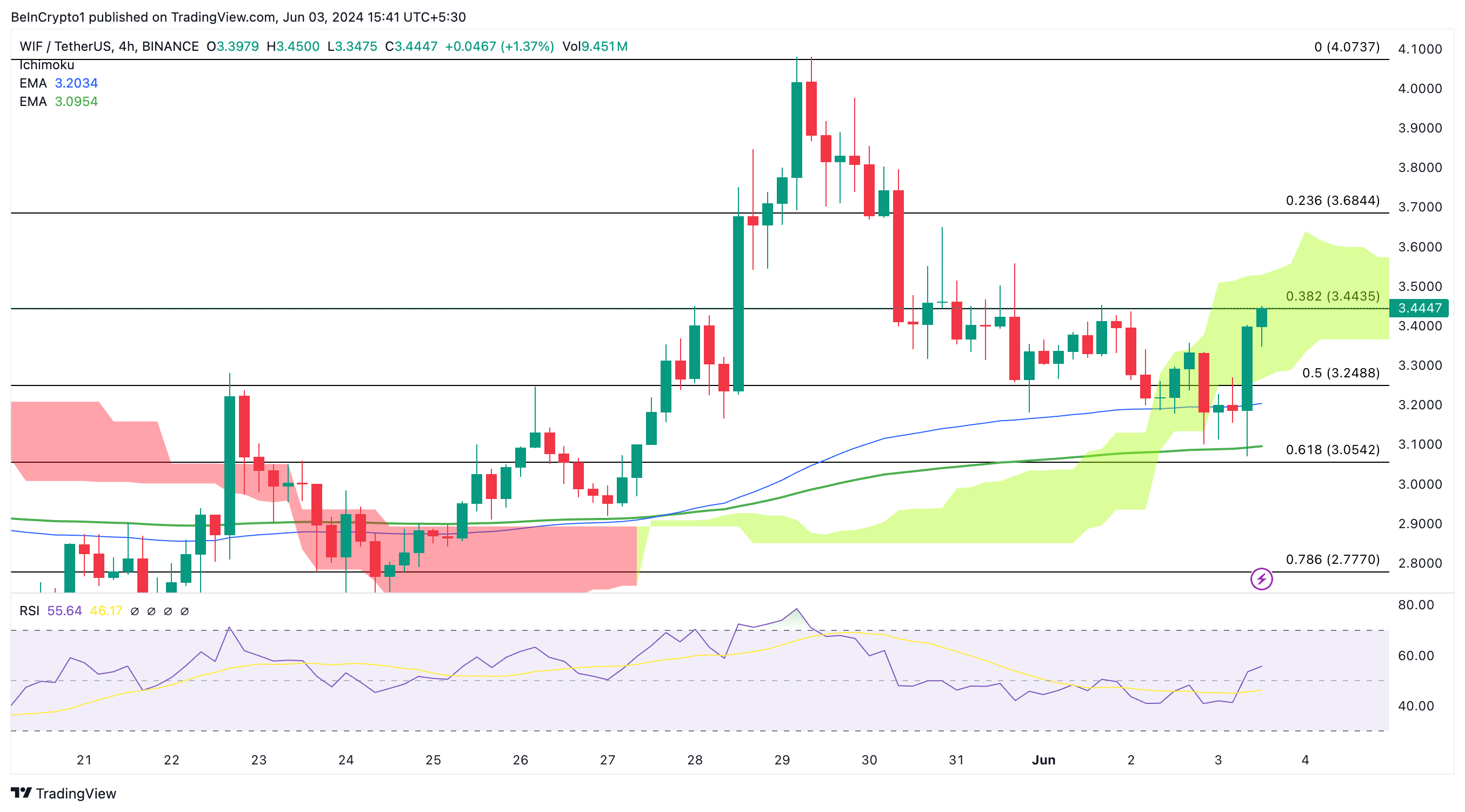 Op dit moment handelt WIF op $3,43, wat een aanzienlijke stijging van 7,44% laat zien. De koers die boven belangrijke Fibonacci-niveaus breekt, ondersteunt deze bullish verwachting.