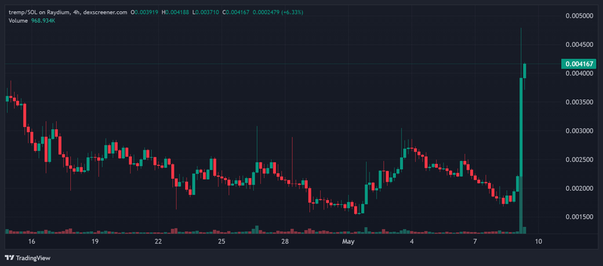 Na de aankondiging kenden meme coins gekoppeld aan politieke figuren een stijging van hun marktwaarde. Deze omvatten Doland Tremp (TREMP) en Jeo Boden (BODEN). TREMP steeg met name van 0,0017 Solana (SOL) naar 0,0047 SOL (ongeveer van $0,24 naar $0,67) voordat het afsloot op 0,0041 SOL (~$0,59).