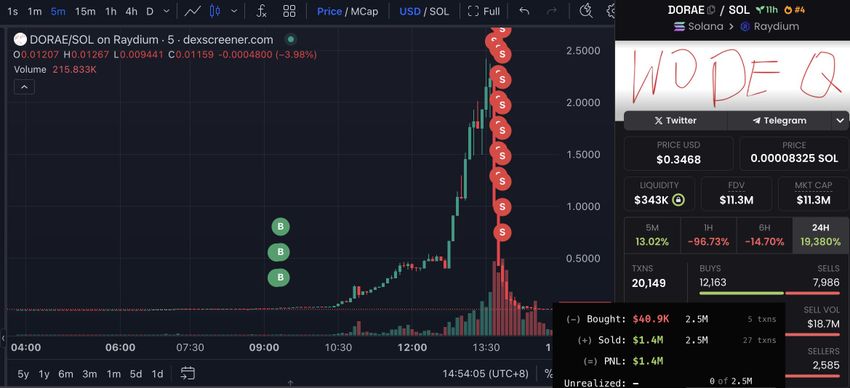 LookOnChain, een firma voor blockchain data-analyse, meldde dat iemand gerelateerd aan de deployer van Doraemon 2,5 miljoen DORAE-tokens heeft gedumpt voor 10.538 Solana-tokens, ter waarde van $1,45 miljoen. De dader ontving 304 SOL van KuCoin en een andere wallet en gebruikte deze fondsen om 2,5 miljoen DORAE-tokens te kopen.