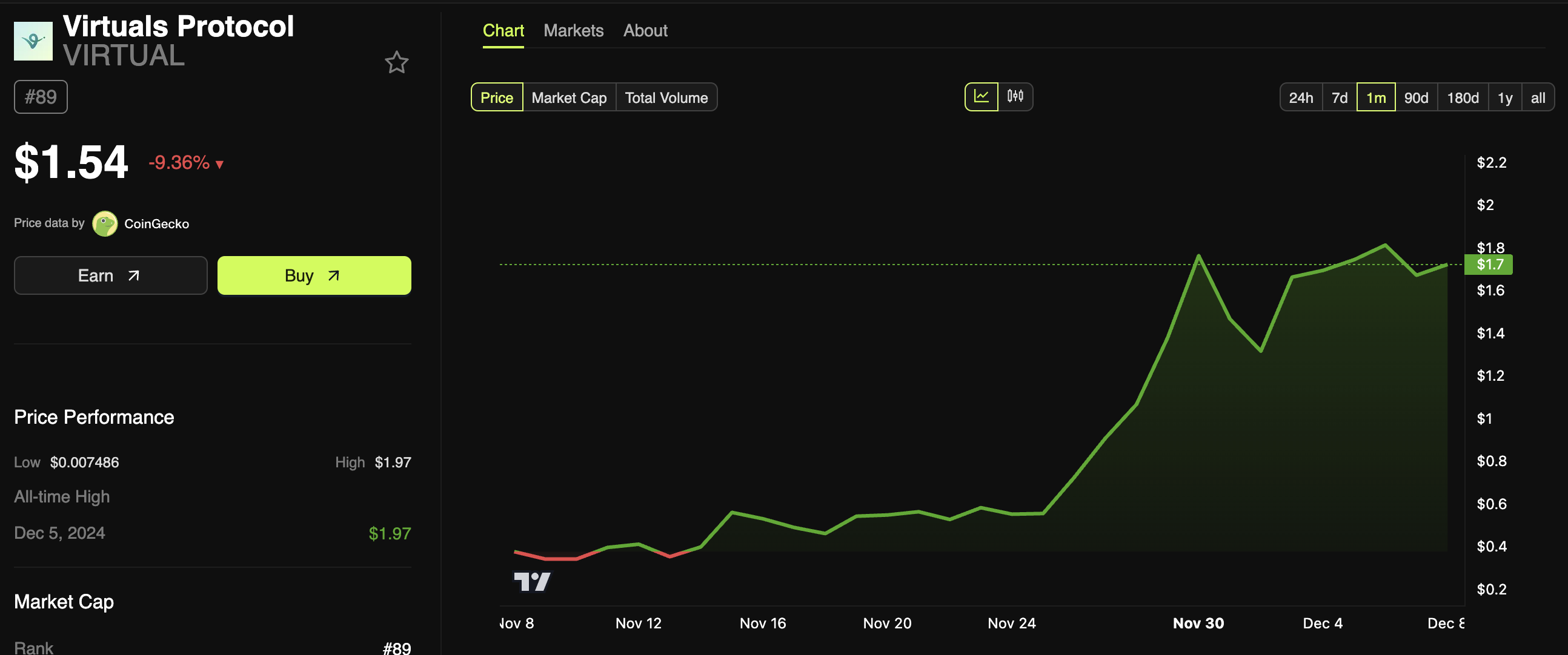 Andreessen Horowitz (a16z) voorspelde dat AI-agenten een van de meest veelbelovende gebieden van toekomstige Web3-technologische ontwikkeling zijn vorige week. Hoewel de sector relatief klein is, groeit het opmerkelijk; verschillende AI-agent tokens zijn gestegen. Virtuals Protocol, een gedecentraliseerd AI-agenten lanceerprotocol, is vorige maand dramatisch gegroeid.