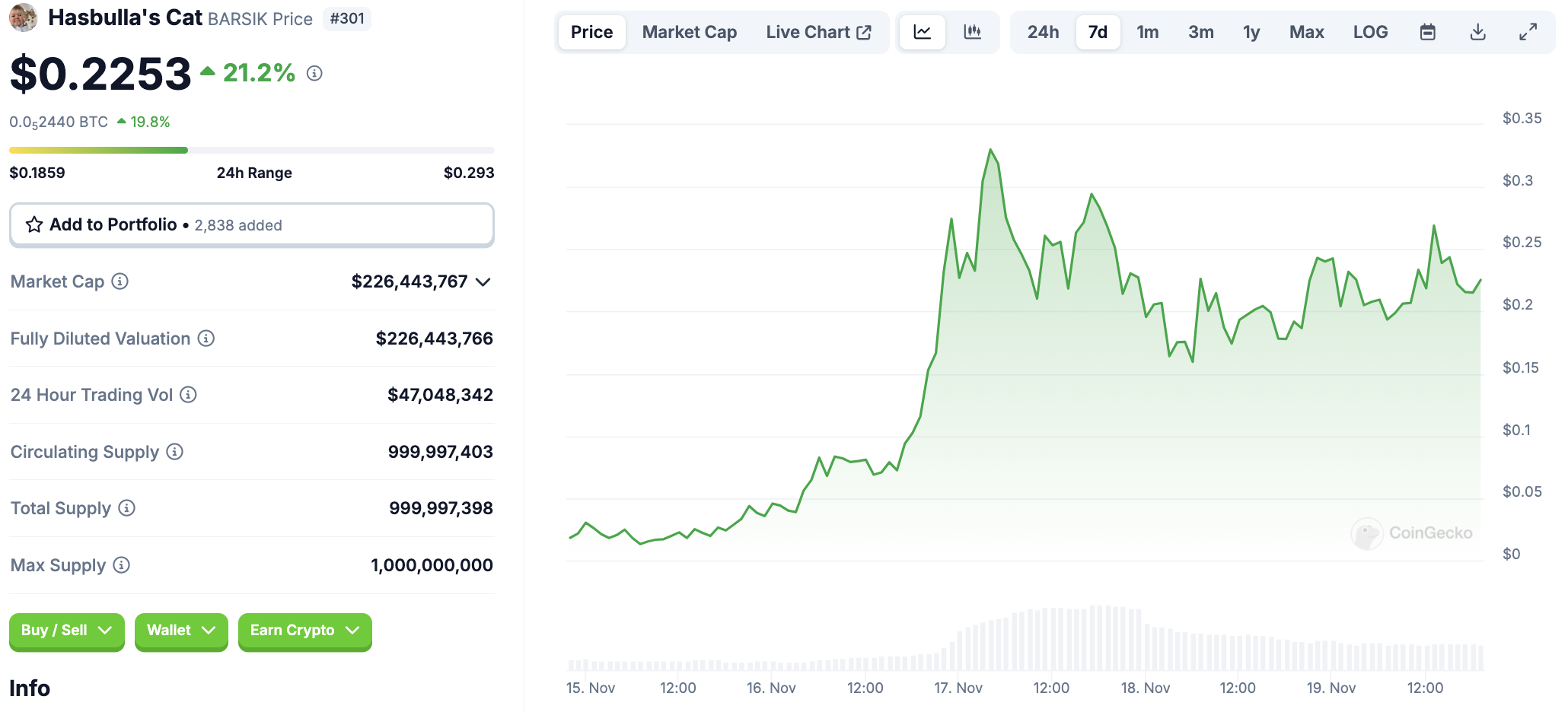 Onverwacht ervoer BARSIK, vernoemd naar Hasbulla’s overleden kat, een onmiddellijke koersstijging. Dit soort pieken zijn gebruikelijk bij nieuwe tokenlanceringen, maar of BARSIK op lange termijn het momentum kan behouden, is een ander verhaal. Op het moment van schrijven wordt het verhandeld tegen $0,22 met een marktkapitalisatie van $226 miljoen.