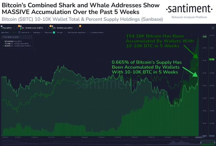 De opmerkingen van Bukele echoën het heersende sentiment. In de afgelopen weken zijn de Bitcoin whales gretig geweest om hun holdings te vergroten. On-chain data van Santiment onthult dat wallets met 10 tot 10.000 BTC agressief 154.160 BTC hebben verzameld, ter waarde van $10,6 miljard, in de afgelopen vijf weken.