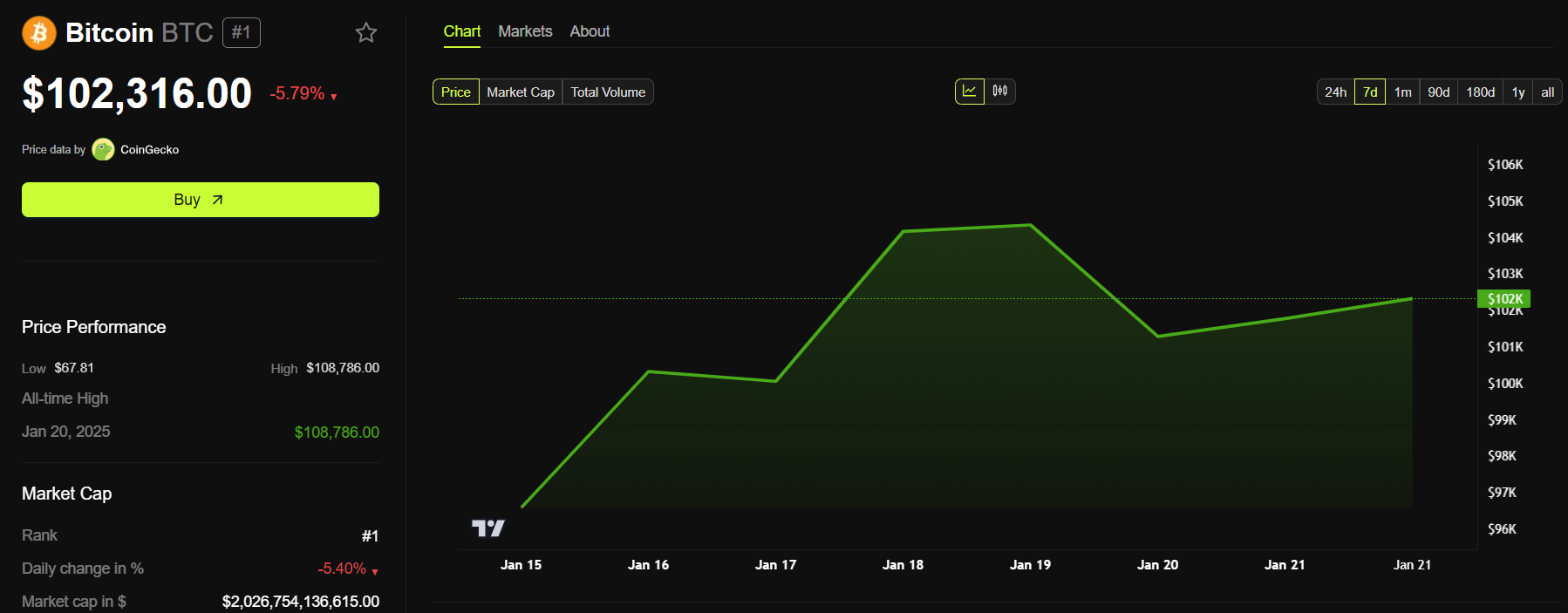Bitcoin werd verhandeld voor $102.316 op het moment van schrijven, een daling van 5,7% in de afgelopen 24 uur.