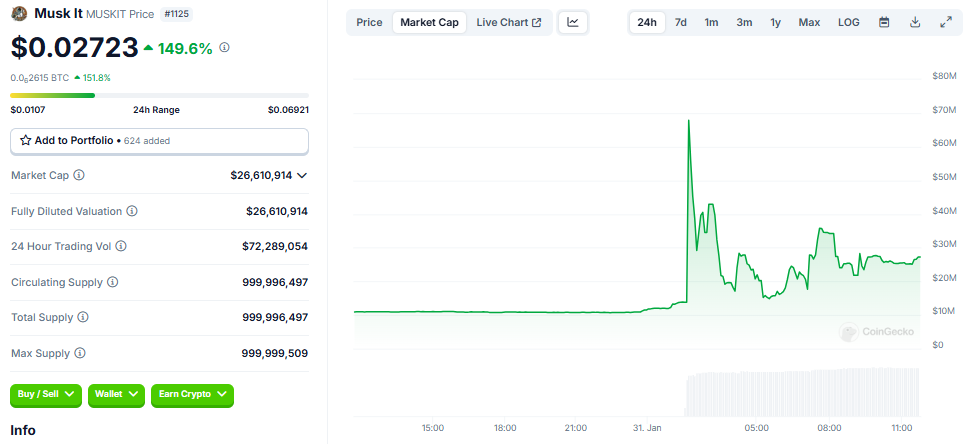 Dit is anders dan de meeste cryptocurrency-projecten, die gedetailleerde tokenomics vrijgeven waarin de toewijzing en distributie van fondsen worden uitgelegd. Desalniettemin tonen gegevens op CoinGecko aan dat de marktkapitalisatie van de Musk It meme coin bijna $27 miljoen bedraagt op het moment van schrijven.