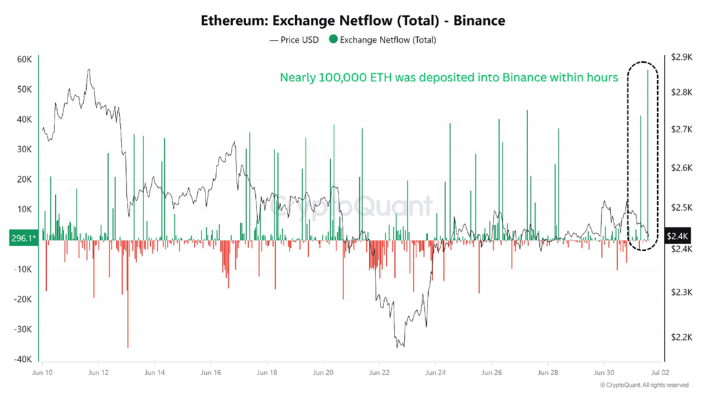 Volgens gegevens van CryptoQuant werden op 1 juli 2025 bijna 100.000 ETH, ter waarde van ongeveer $250 miljoen, gestort op Binance. Dit was de grootste instroom op één dag naar de exchange in de afgelopen maand.